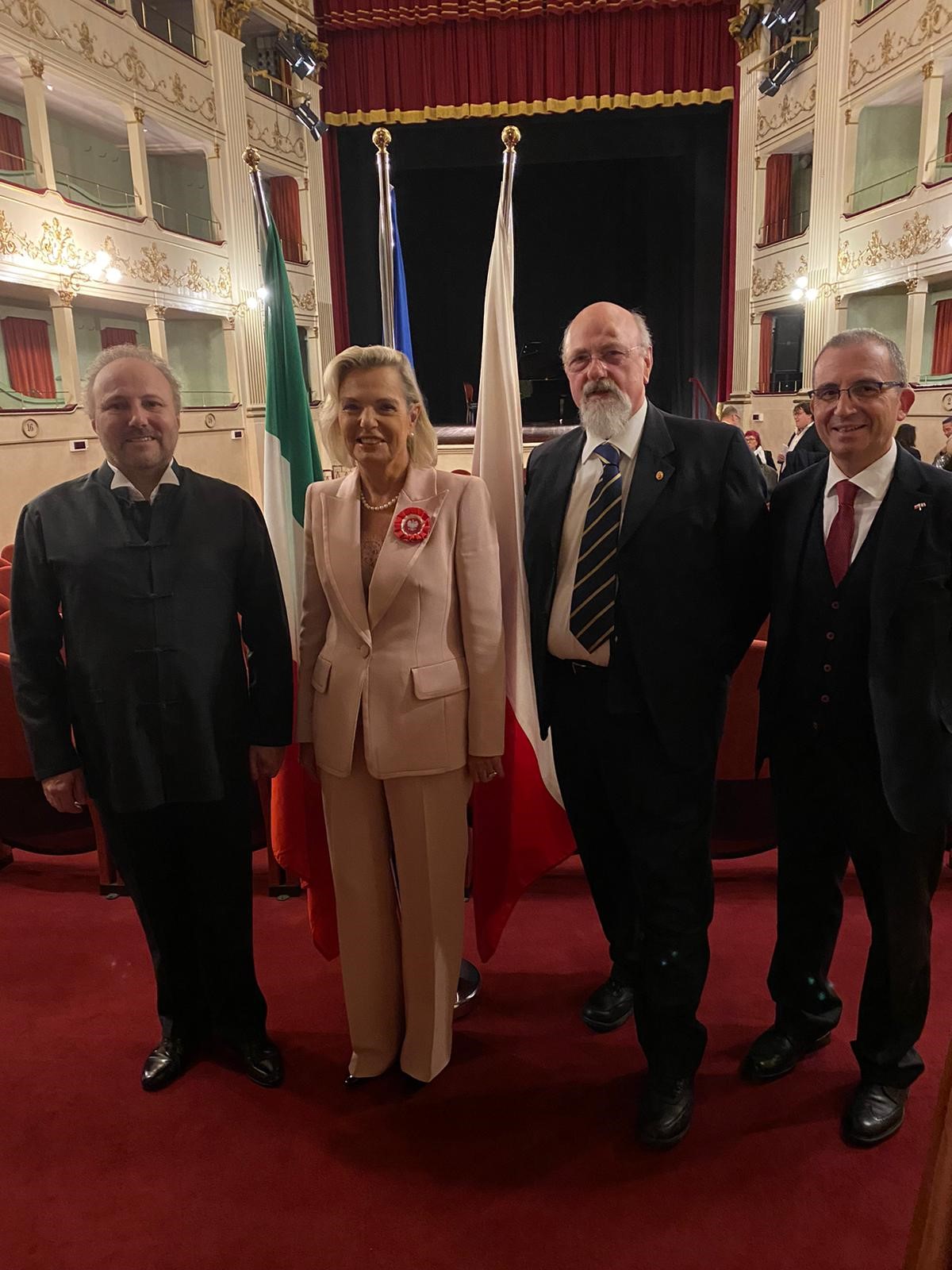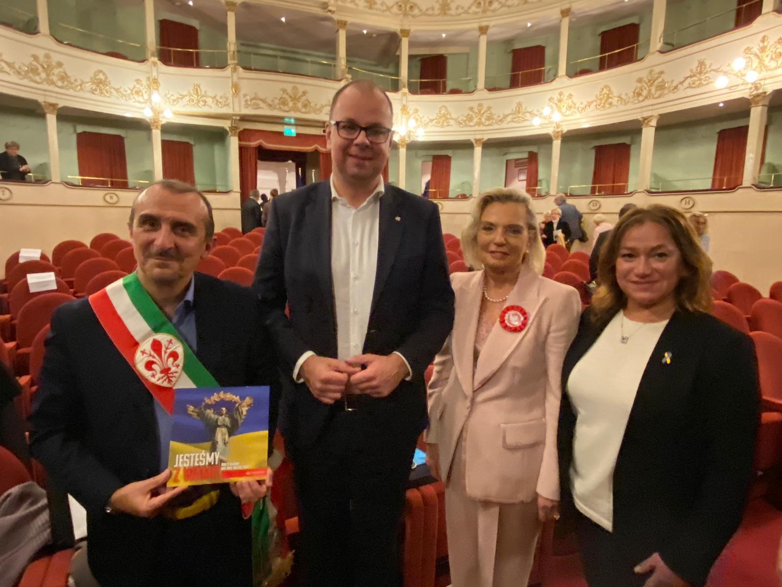 L’evento che si è svolto in presenza dell’ambasciatore di Polonia in Italia Anna Maria Anders e del console onorario a Firenze Stefano Barlacchi è stato organizzato dall’Ambasciata di Polonia a Roma in collaborazione con il Consolato onorario della Repubblica di Polonia per la Toscana. Tra le numerose autorità civili, militari e religiose presenti anche Luca Milani, presidente del Consiglio comunale di Firenze, e il direttore degli Uffizi Eike Schmidt, oltre a consoli onorari di diversi Paesi e una nutrita rappresentanza della comunità ucraina di Firenze. All’eccezionale serata ha infatti partecipato anche il sindaco della città polacca di Przemyśl Wojciech Bakun a cui in mattinata, durante la cerimonia a Palazzo Vecchio, era stato consegnato lo Scudo d’Argento conferito dall’Istituto Scudi di San Martino di Firenze alla cittadinanza di Przemyśl per l’aiuto e la straordinaria solidarietà verso i profughi ucraini. Il secondo riconoscimento al sindaco della città polacca è giunto invece poco prima del concerto: l’amministrazione comunale di Firenze, rappresentata da Luca Milani, ha consegnato a Wojciech Bakun una targa come riconoscimento del grande sforzo umanitario profuso dalla municipalità polacca nei confronti dei profughi ucraini in fuga dalla guerra. Il sindaco ha poi sottolineato nel suo discorso come tanti italiani abbiano lavorato nel centro di assistenza di Przemyśl diventata epicentro del volontariato mondiale.