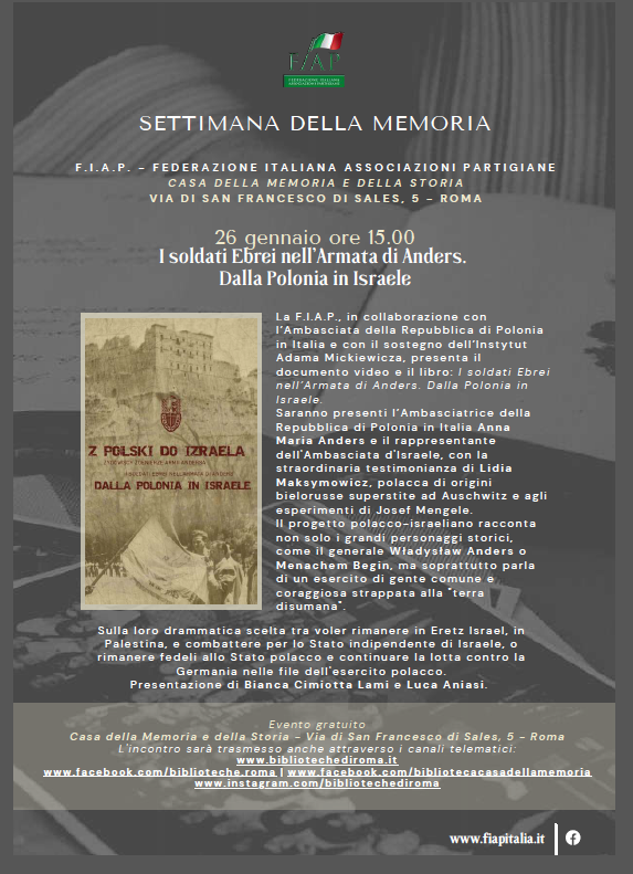 In occasione delle celebrazioni della Giornata della Memoria l’Ambasciata della Repubblica di Polonia in Italia in collaborazione con la Federazione Italiana Associazioni Partigiane e con il sostegno dell’Istituto Adam Mickiewicz di Varsavia organizza il giorno 26 gennaio alle ore 15.00 nella Casa della Memoria e della Storia di Roma la presentazione del documento video e del libro: “I soldati Ebrei nell’Armata di Anders. Dalla Polonia in Israele”.