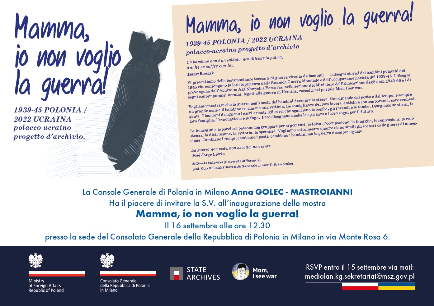 Gentilissimi, La Console Generale Anna Golec-Mastroianni Vi invita alla mostra "Mamma, non voglio la guerra!".