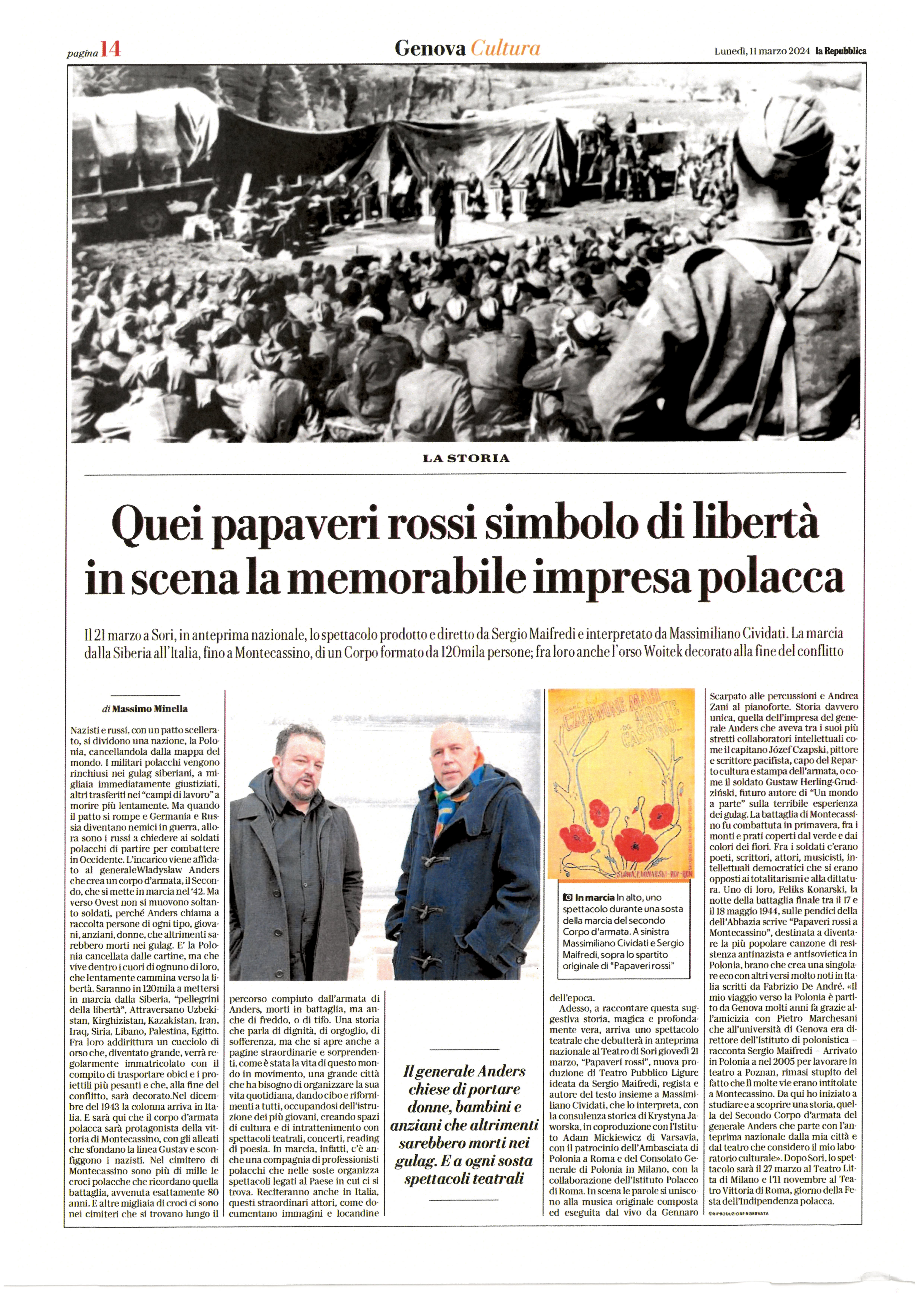 Ore 20. 30 lo spettacolo teatrale PAPAVERI ROSSI reg. Sergio Maifredi che debutta in prima nazionale il 27 marzo 2024 al Teatro Litta – Manifatture Teatrali Milanesi di Milano