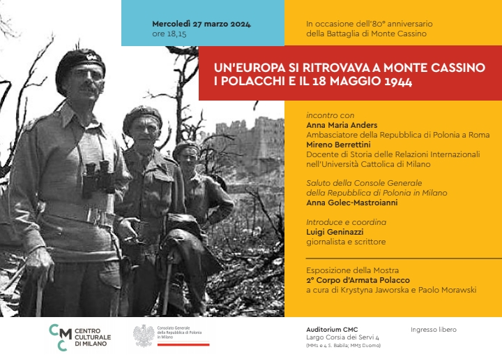 Abbiamo il piacere di invitarvi alla serata dedicata all’80° anniversario della battaglia di Montecassino e al 2 Corpo d’Armata del Generale Władysław Anders che ha combattuto per la nostra e la vostra libertà contro le armate nazifasciste.