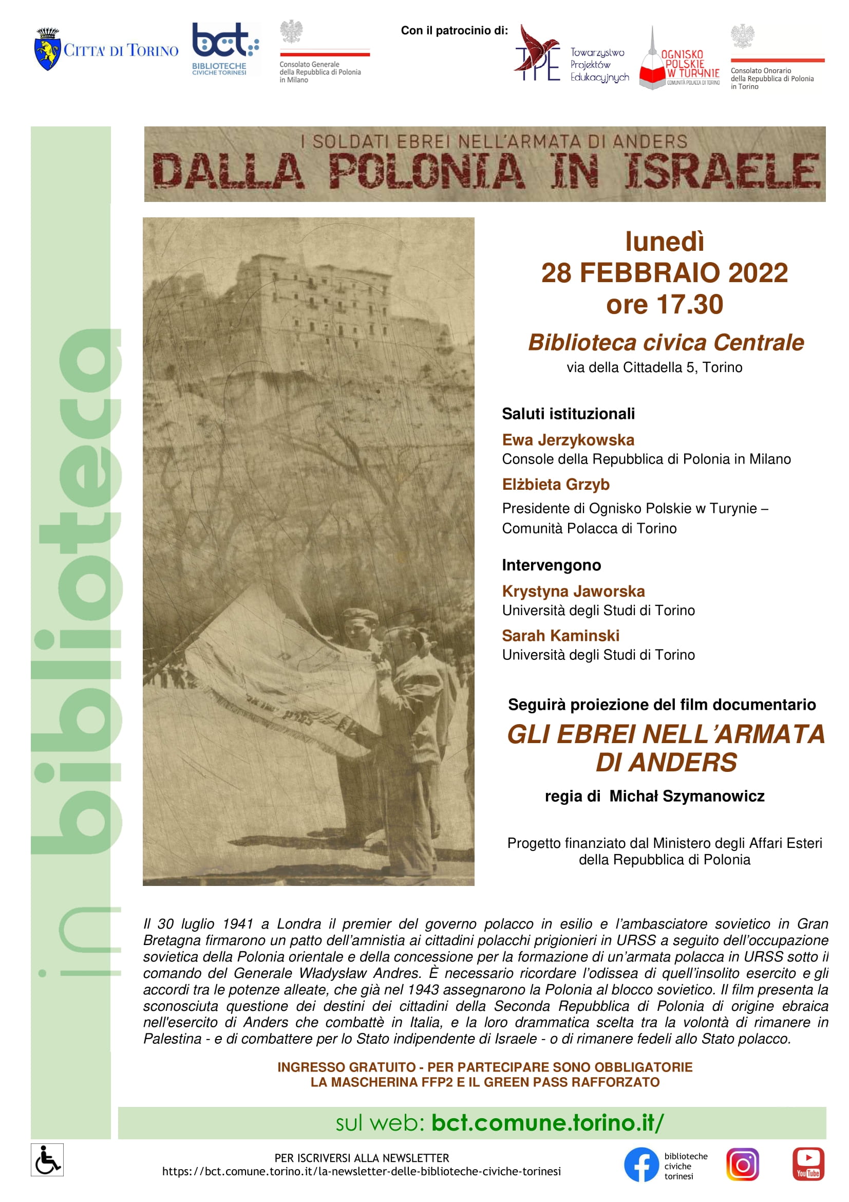 Vi invitiamo alla proiezione del film documentario "I soldati Ebrei neI soldati Ebrei nell’Armata di Anders. Dalla Polonia in Israelell’Armata di Anders" che si terrà il 28.02.2022 alle 17:30 nella Biblioteca civica Centrale a Torino.