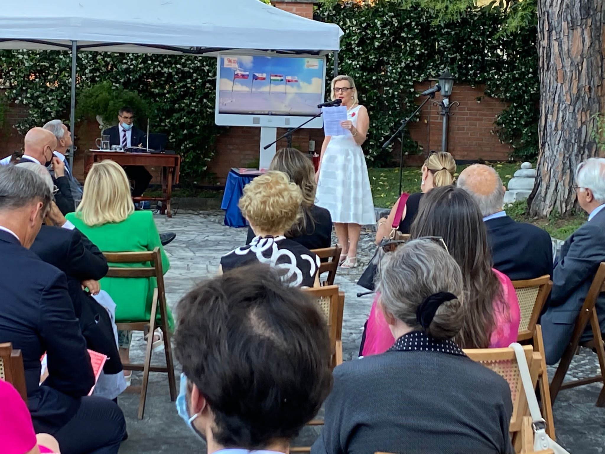 Rappresentanti del mondo della politica, diplomazia e della cultura sono giunti per partecipare a una serata speciale nei giardini della rappresentanza diplomatica polacca a Roma. Il pubblico ha potuto ascoltare un concerto di successi internazionali di rivista e d'opera eseguiti dal tenore polacco Iwo Orłowski e di guardare un interessante film realizzato dall'Ambasciata di Polonia a Roma con la partecipazione di diplomatici delle ambasciate dei paesi V4 a Roma, registrato nell’Antico Caffè Greco, storica caffetteria della capitale, nel quale i diplomatici raccontano i legami storici e culturali dei loro paesi con l’Italia.