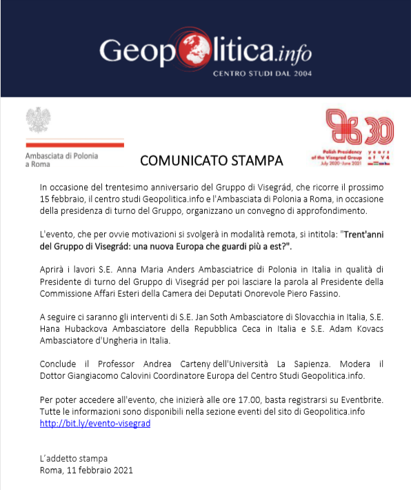 Trent’anni del Gruppo di Visegràd: una nuova Europa che guardi ad est? – 15 febbraio 2021, ore 17.00 – 18.30 Questo e' il titolo della conferenza on-line organizzata dall’Ambasciata di Polonia in Italia in occasione della Presidenza del Gruppo di Visegràd e dal Centro Studi Geopolitica.info.