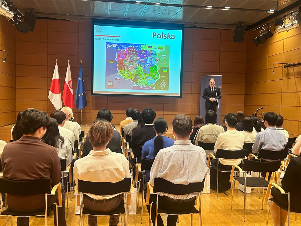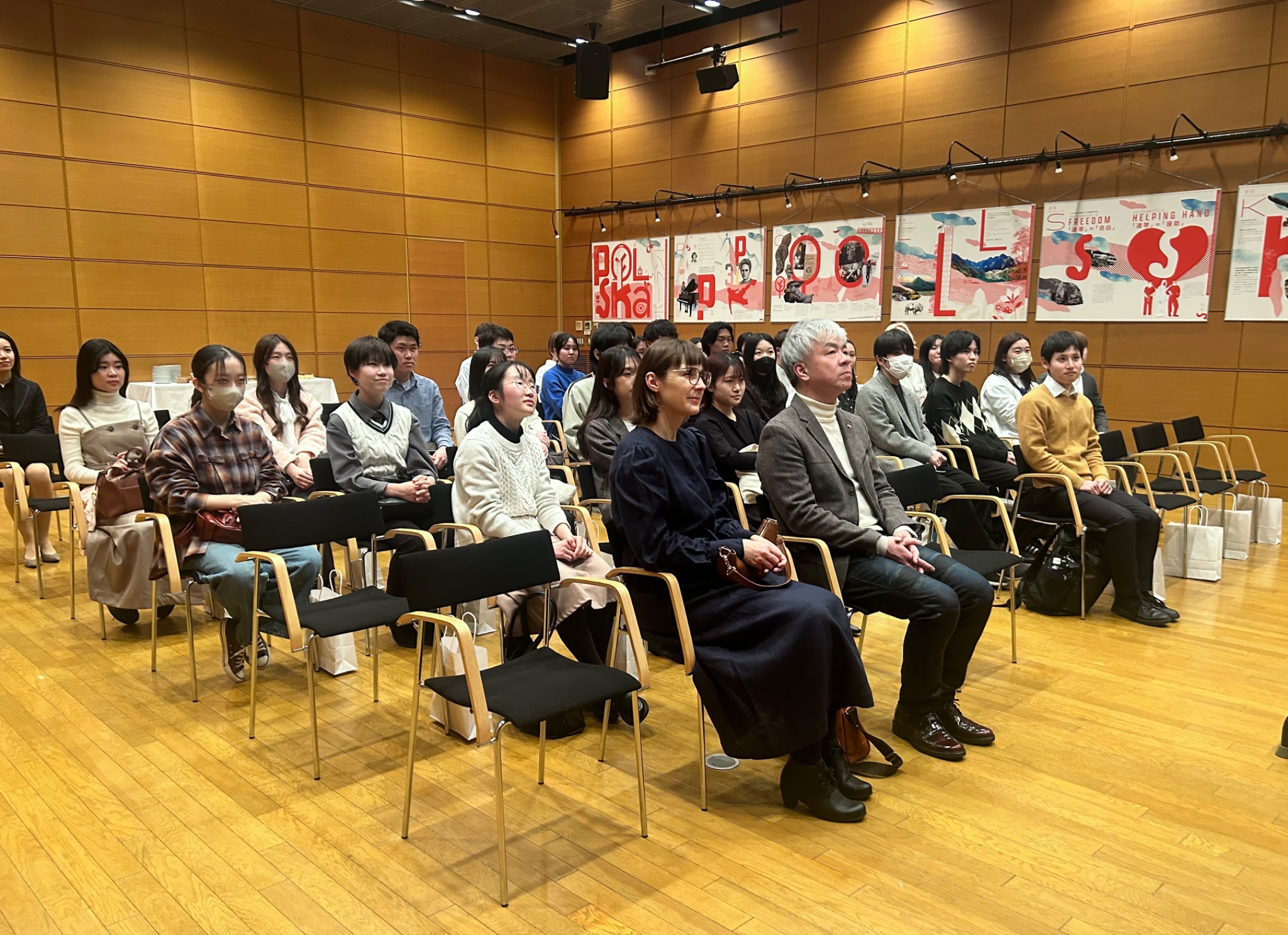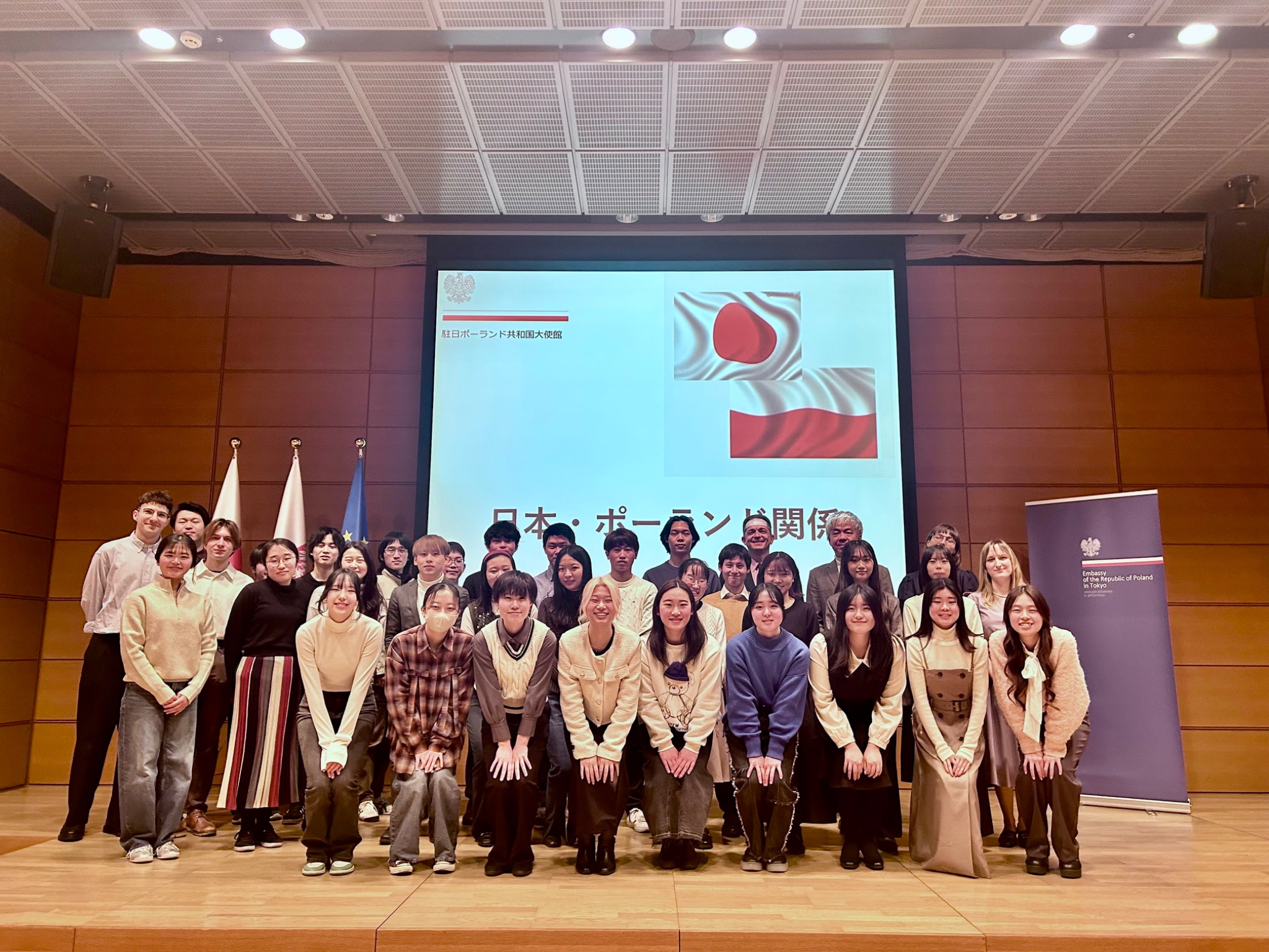 W spotkaniu noworocznym w Ambasadzie, które odbyło się z naszej inicjatywy, uczestniczyło aż ok. 40 studentów polonistyki TUFS w towarzystwie kierownika Katedry Języka Polskiego TUFS Profesora Koji Mority oraz wykładowczyni języka polskiego Soni Czaplewskiej. Na wstępie Ambasador Milewski przywitał gości, wyrażając głębokie uznanie dla ogromnego wysiłku wykładowców i studentów na rzecz nauki języka polskiego i promocji kultury polskiej w Japonii. Następnie studenci wysłuchali prezentacji nt. Polski i relacji polsko-japońskich poprowadzonej w języku polskim przez Panią III Sekretarz Julię Cichy. Na zakończenie spotkania odbył się poczęstunek z polskimi ciastami.