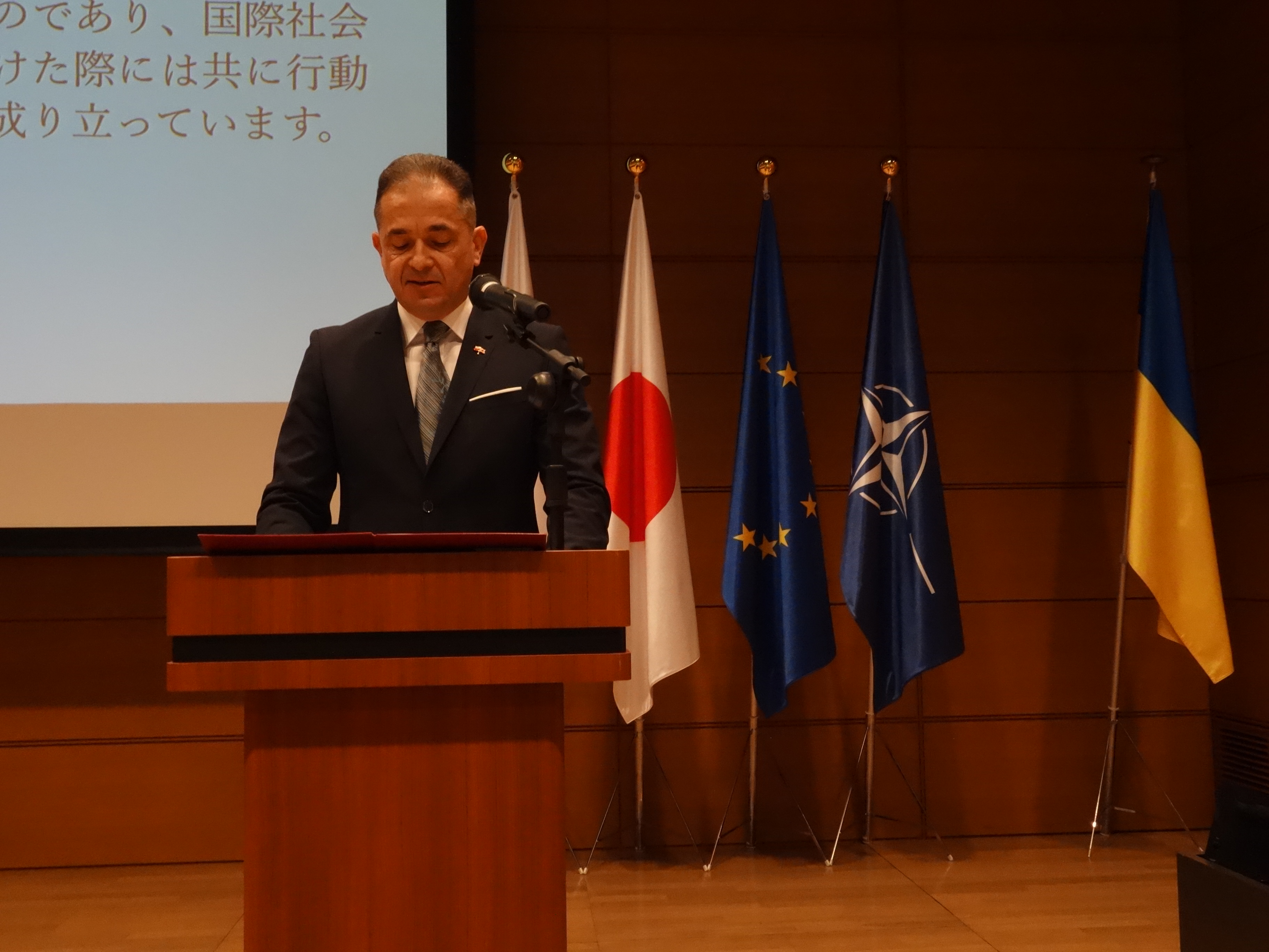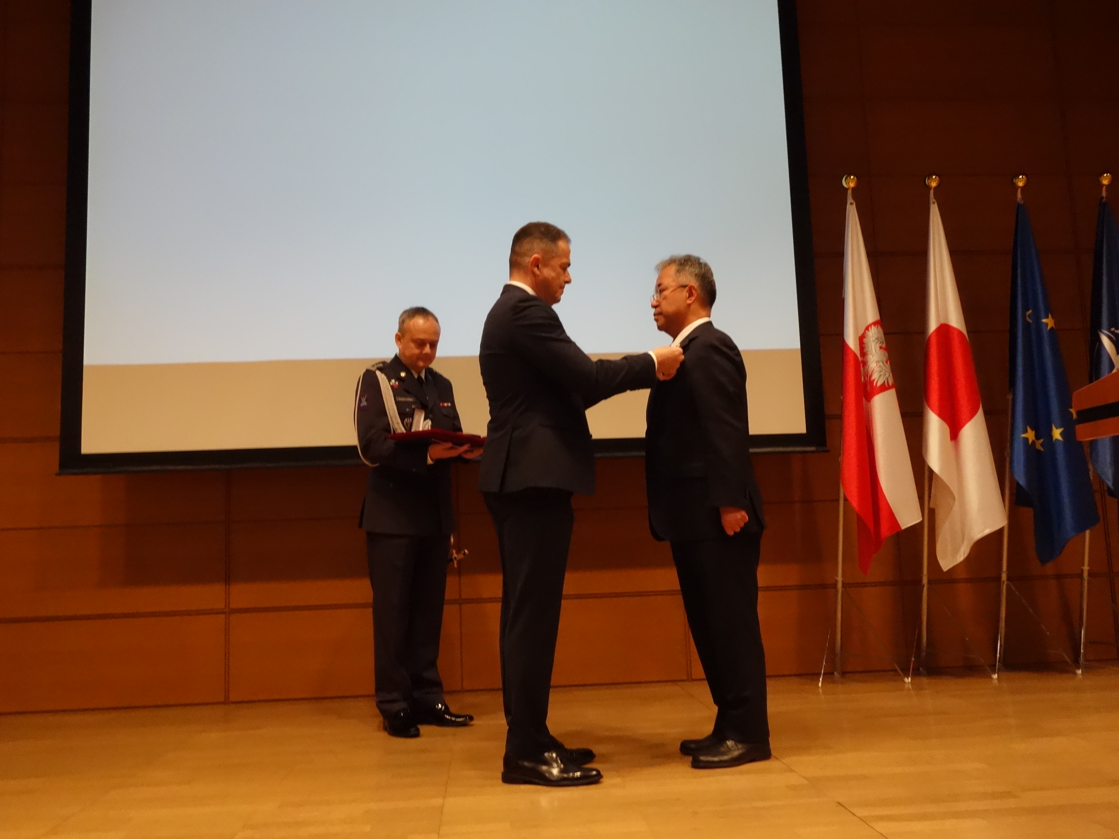 Po wysłuchaniu hymnów państwowych—polskiego i japońskiego, Ambasador Paweł Milewski, wspólnie z Attaché Obrony RP w Japonii płk Maciejem Remkowskim, powitali zgromadzonych, podkreślając znaczenie polityczne, gospodarcze i obronne Polski w UE, NATO i na świecie. Ambasador zwrócił uwagę, że ambitna polityka RP w obszarze finansowania i rozwoju zdolności obronnych jest konieczna w obliczu zagrożeń ze strony Rosji—której polityka imperialna stanowi wyzwanie dla bezpieczeństwa i interesów zarówno Polski, jak i Japonii. Następnie przemówienia wygłosili japońscy goście honorowi: Marszałek Izby Reprezentantów i Przewodniczący Japońsko-Polskiej Grupy Parlamentarnej w Izbie Reprezentantów Fukushiro Nukaga, Wiceminister Spraw Zagranicznych Ayano Kunimitsu, Przewodniczący Japońsko-Polskiej Grupy Parlamentarnej w Izbie Radców Hirofumi Nakasone oraz Generał Yoshihide Yoshida, któremu Ambasador—wspólnie z Attaché Obrony RP—wręczył Medal Sztabu Generalnego Wojska Polskiego.