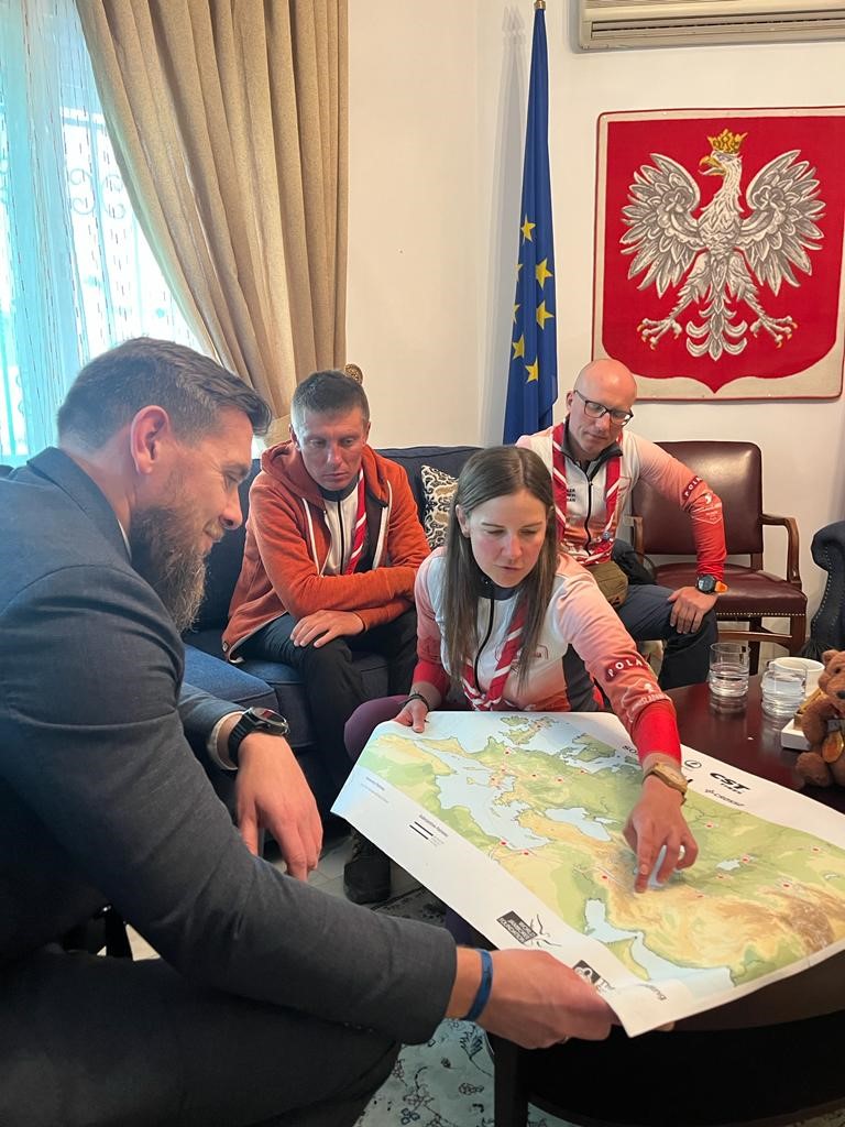 Ambassador Lucjan Karpiński met with the participants of the "JednoŚladami Andersa" travel project, which involves cycling the route of General Anders's army, traversed 80 years ago by Polish soldiers and refugees from the USSR. During the meeting, there was a symbolic handover of the baton between the individual groups of the relay.