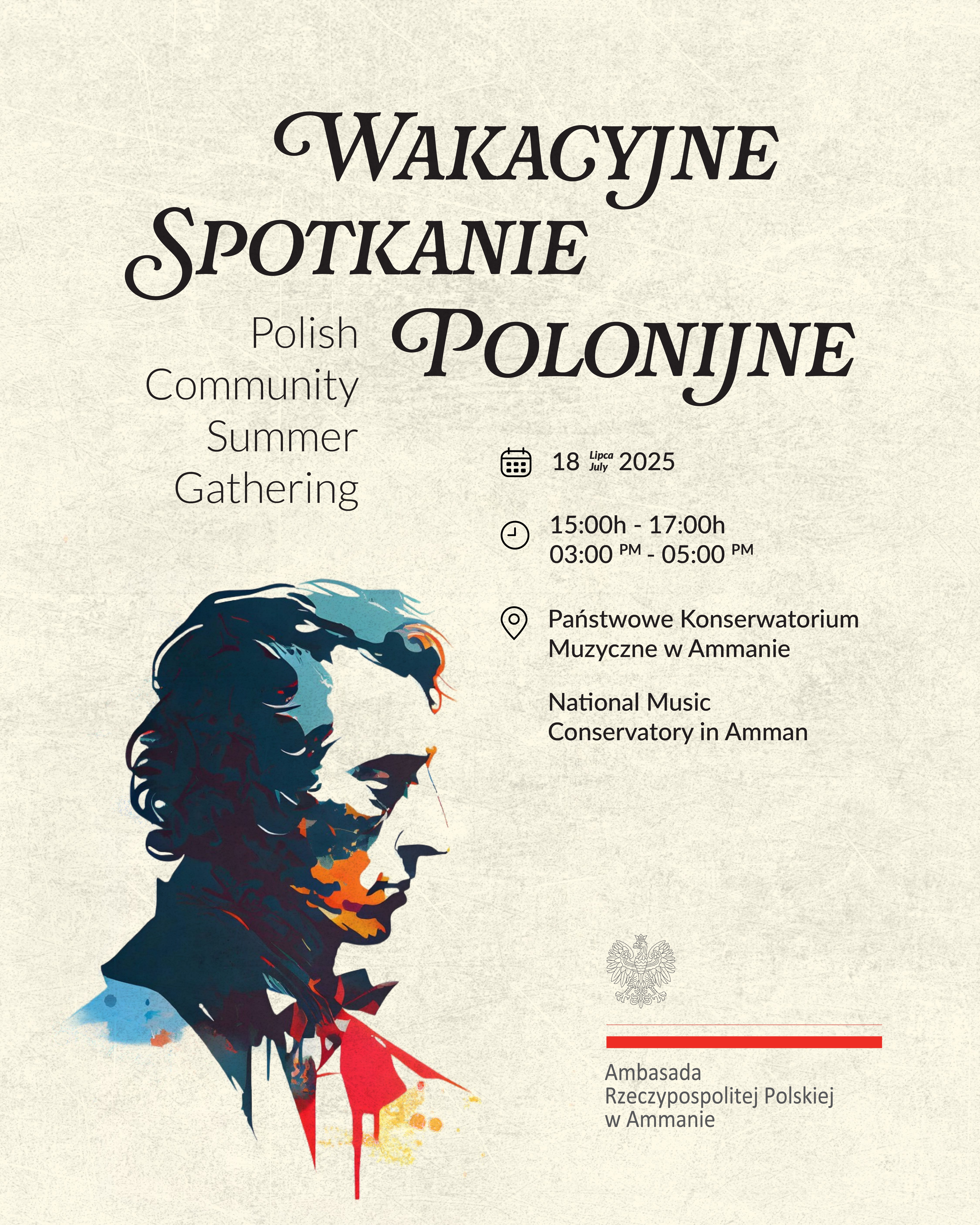 18 lipca br. w Państwowym Konserwatorium Muzycznym w Ammanie odbyło się wakacyjne spotkanie Polonii jordańskiej. W programie wydarzenia znalazły się recitale na fortepian Yulii Yezdakovej (Ukraina - Ammańska Orkiestra Kameralna) oraz Mohammeda Tahy na marimbę (Jordania - gospodarz) - artyści wykonali utwory Fryderyka Chopina, hymny państwowe Polski i Jordanii oraz polskie i jordańskie utwory patriotyczne. Dla najmłodszych uczestników przygotowano Kącik Bajek z utworami Juliana Tuwima. W wydarzeniu wzięło udział ponad 70 przedstawicieli Polonii jordańskiej.