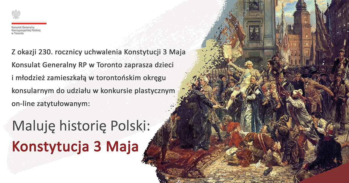 Z okazji 230. rocznicy uchwalenia Konstytucji 3 Maja Konsulat Generalny RP w Toronto zaprasza dzieci i młodzież zamieszkałą w torontońskim okręgu konsularnym do udziału w konkursie plastycznym on-line zatytułowanym: Maluję historię Polski - Konstytucja 3 Maja.