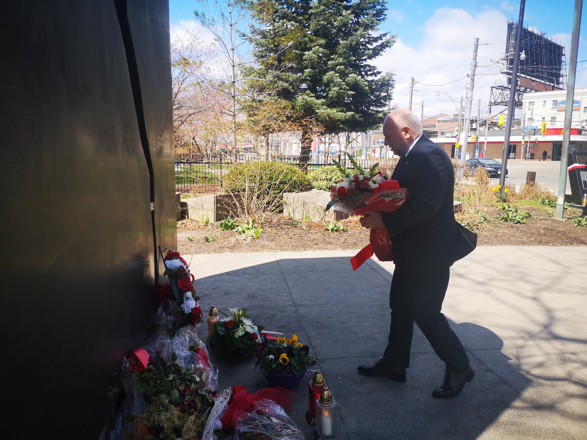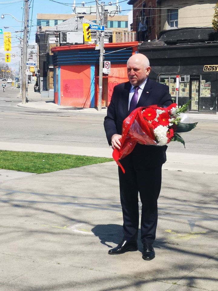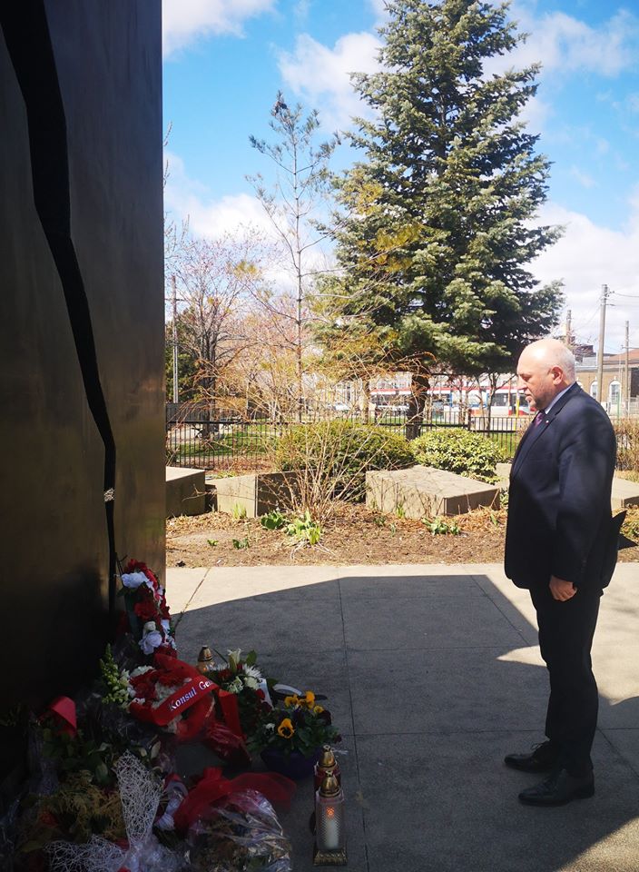 W 80. rocznicę zbrodni katyńskiej oraz 10. rocznicę katastrofy smoleńskiej, Konsul Generalny RP Krzysztof Grzelczyk złożył kwiaty pod Pomnikiem Katyńskim i Tablicą Smoleńską w Toronto