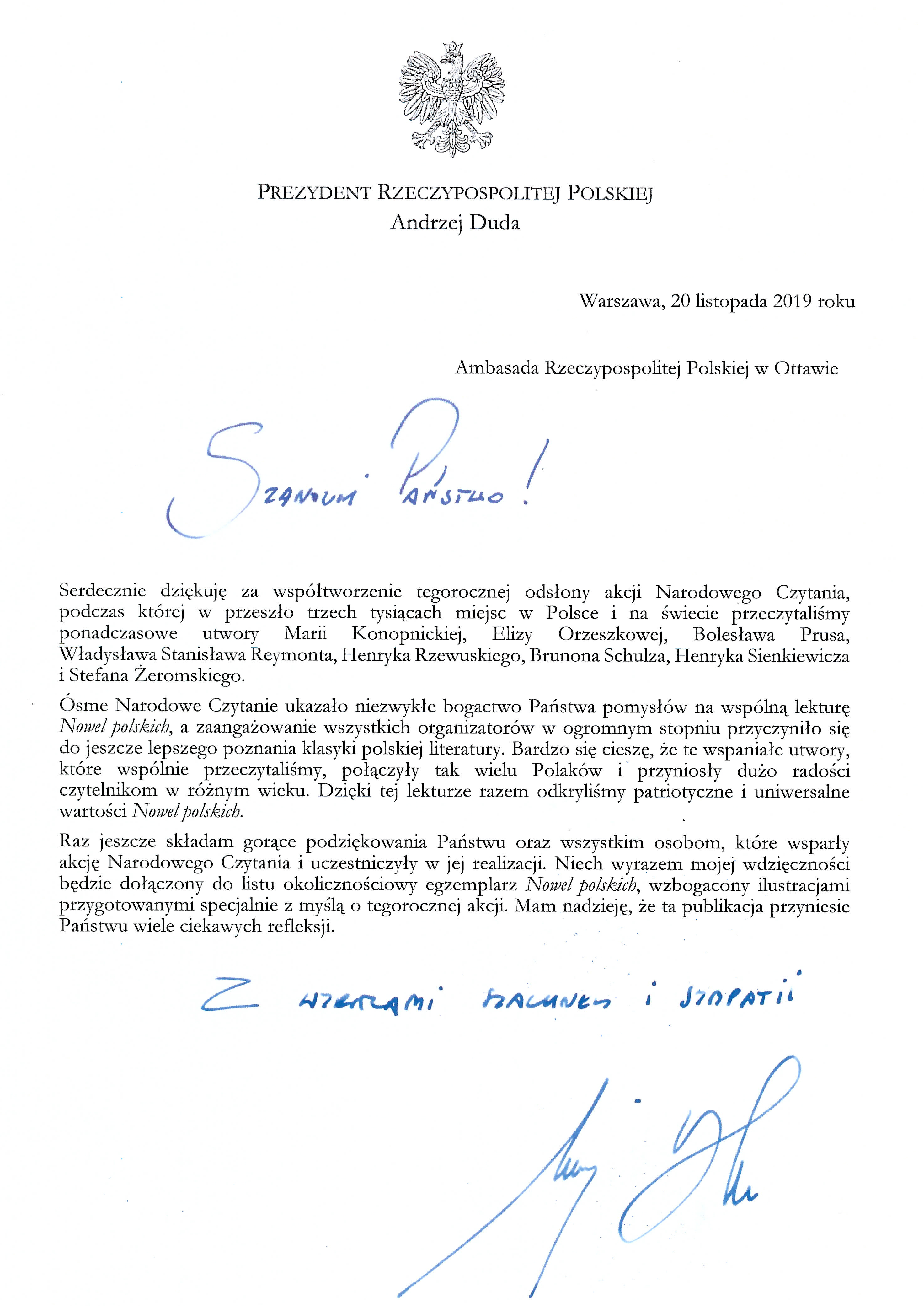 List prezydenta Andrzeja Dudy - podziękowania za akcję Narodowe Czytanie.