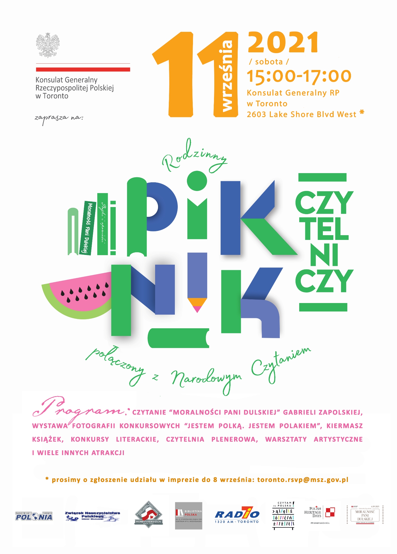 Konsulat Generalny RP w Toronto już dzisiaj serdecznie zaprasza 11 września o godzinie 15:00 na Narodowe Czytanie połączone z Rodzinnym Piknikiem Czytelniczym w ogrodzie Konsulatu. *