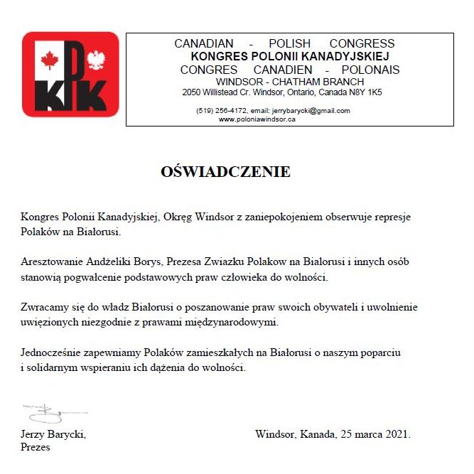Organizacje polonijne w Kanadzie wyrażają solidarność i przesyłają słowa wsparcia dla mniejszości polskiej na Białorusi.
