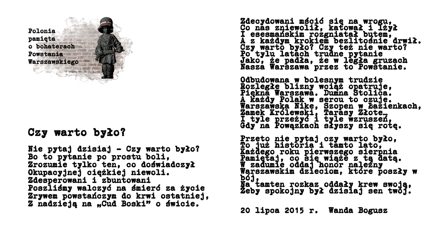 Akcja: „Polonia pamięta o bohaterach Powstania Warszawskiego” spotkała się z dużym zainteresowaniem Polonii. Do Konsulatu napłynęło kilkadziesiąt różnorodnych prac (fotografie, utwory poetyckie, piosenki). Poniżej prezentujemy kilka zdjęć. Z uwagi na duże powodzenia akcji planujemy jej powtórzenie w przyszłym roku.
