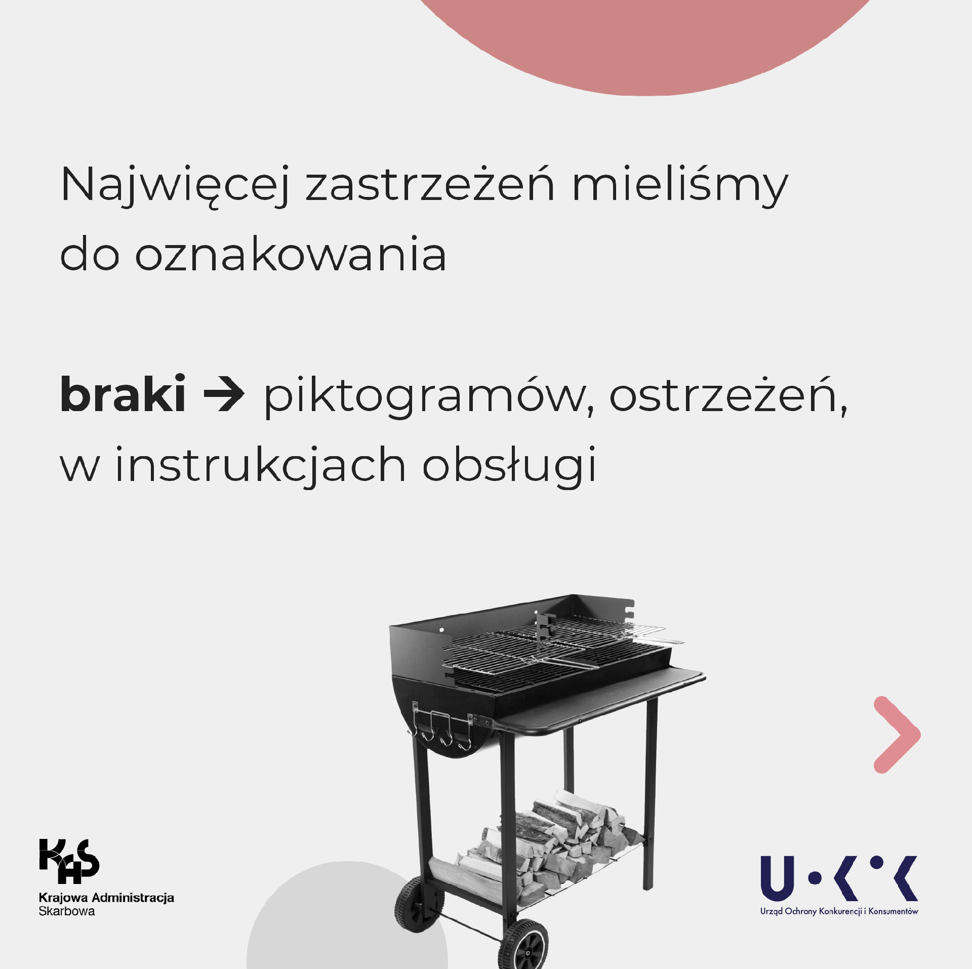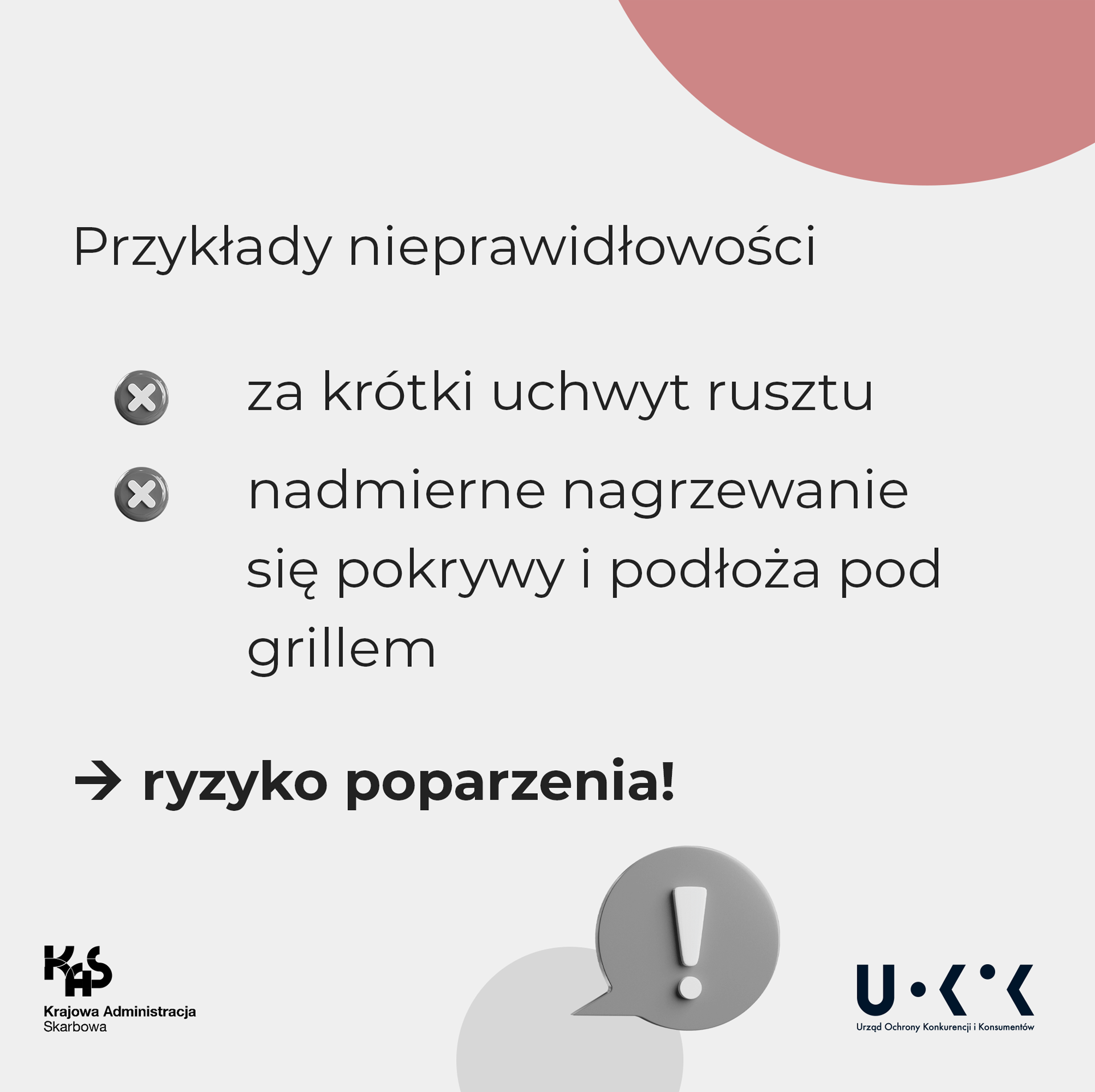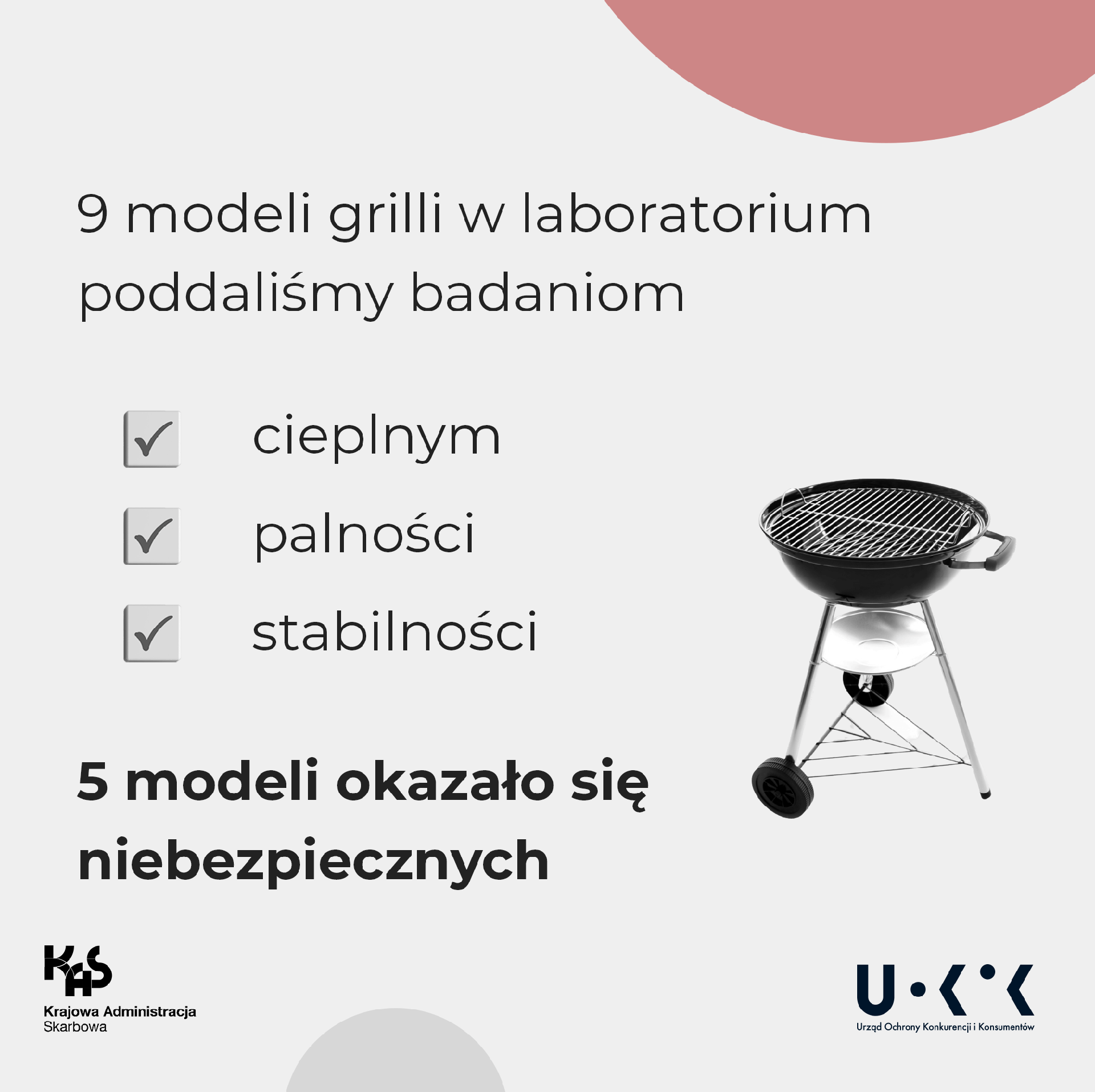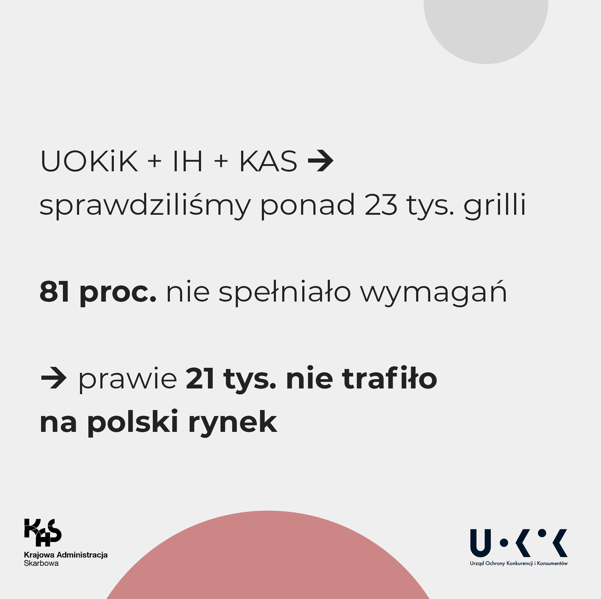 W okresie od 1 marca do 31 maja 2023 r. KAS wraz z Urzędem Ochrony Konkurencji i Konsumentów (UOKiK) oraz Inspekcją Handlową (IH) realizowała kontrole grilli tradycyjnych. Skontrolowano 23 478 szt. grilli – 21 różnych modeli wytypowanych do kontroli przez funkcjonariuszy KAS, 9 modeli zostało wytypowanych przez inspektorów IH do badań laboratoryjnych. Podczas badań w laboratorium sprawdzono m.in. wymiary elementów konstrukcyjnych i przeprowadzono badania cieplne, palności i stabilności. Inspekcja Handlowa zakwestionowała 17 z 21 modeli grilli tradycyjnych wytypowanych do kontroli przez funkcjonariuszy KAS, w tym 16 ze względu na nieprawidłowe oznakowanie. W zakresie wymagań konstrukcyjnych zakwestionowano 5 z 9 zbadanych modeli grilli ze względu na ryzyko poparzenia – 4 z nich miały również nieprawidłowości w oznakowaniu. W wyniku wspólnych działań prawie 21 tys. szt. grilli nie zostało dopuszczonych do obrotu.