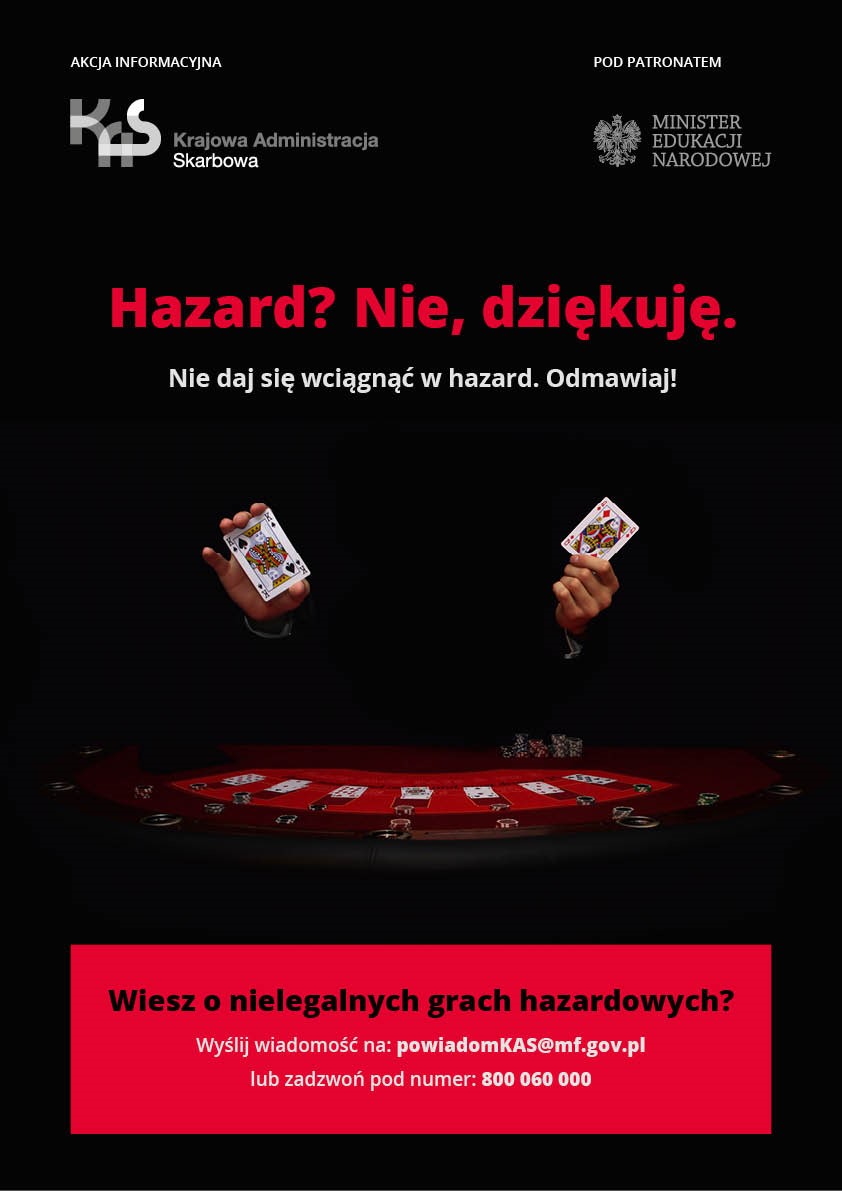 Krajowa Administracja Skarbowa kontynuuje akcję informacyjną „Hazard? Nie, dziękuję” w bieżącym roku szkolnym i akademickim. Kampanię KAS objął honorowym patronatem Minister Edukacji Narodowej, podkreślając, że jej założenia wpisują się w działania MEN w zakresie poprawy bezpieczeństwa uczniów oraz wzmocnienia profilaktyki uzależnień w szkołach i placówkach oświatowych.