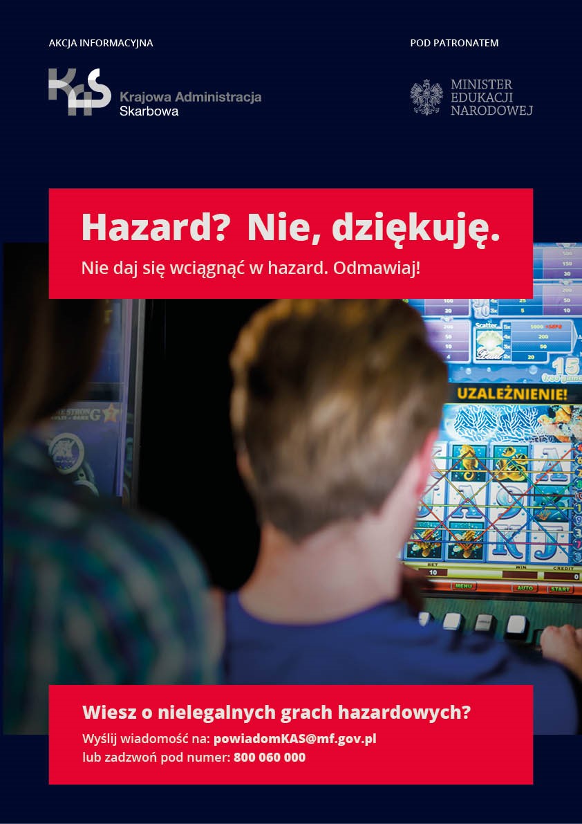 - Krajowa Administracja Skarbowa kontynuuje ogólnopolską akcję informacyjną, której celem jest podniesienie świadomości o zagrożeniach związanych z uzależnieniem od hazardu oraz uczestnictwem w nielegalnych grach hazardowych.