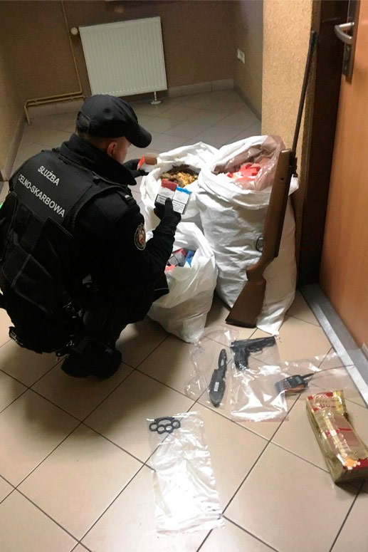 Funkcjonariusze przeszukali 6 lokalizacji na terenie czterech miejscowości, gdzie mogło dochodzić do nielegalnej produkcji podrabianych wyrobów tytoniowych. Podczas kontroli zatrzymali m.in.: papierosy, tytoń krojony i susz tytoniowy oraz kilka urządzeń służących do nabijania tytoniem gilz papierosowych. Zabezpieczyli również puste gilzy do nabijania tytoniem oraz gilzy w opakowaniach udających „firmowe" - w sumie ponad 22 tys. szt., a także ponad 1,5 tys. pustych opakowań na papierosy. Opakowania na produkowane nielegalnie wyroby tytoniowe posiadały firmowe oznaczenia zastrzeżone dla kilku znanych marek papierosowych. W trakcie przeszukania jednego z pomieszczeń mieszkalnych funkcjonariusze ujawnili również przedmioty przypominające broń palną, kastet oraz nóż.