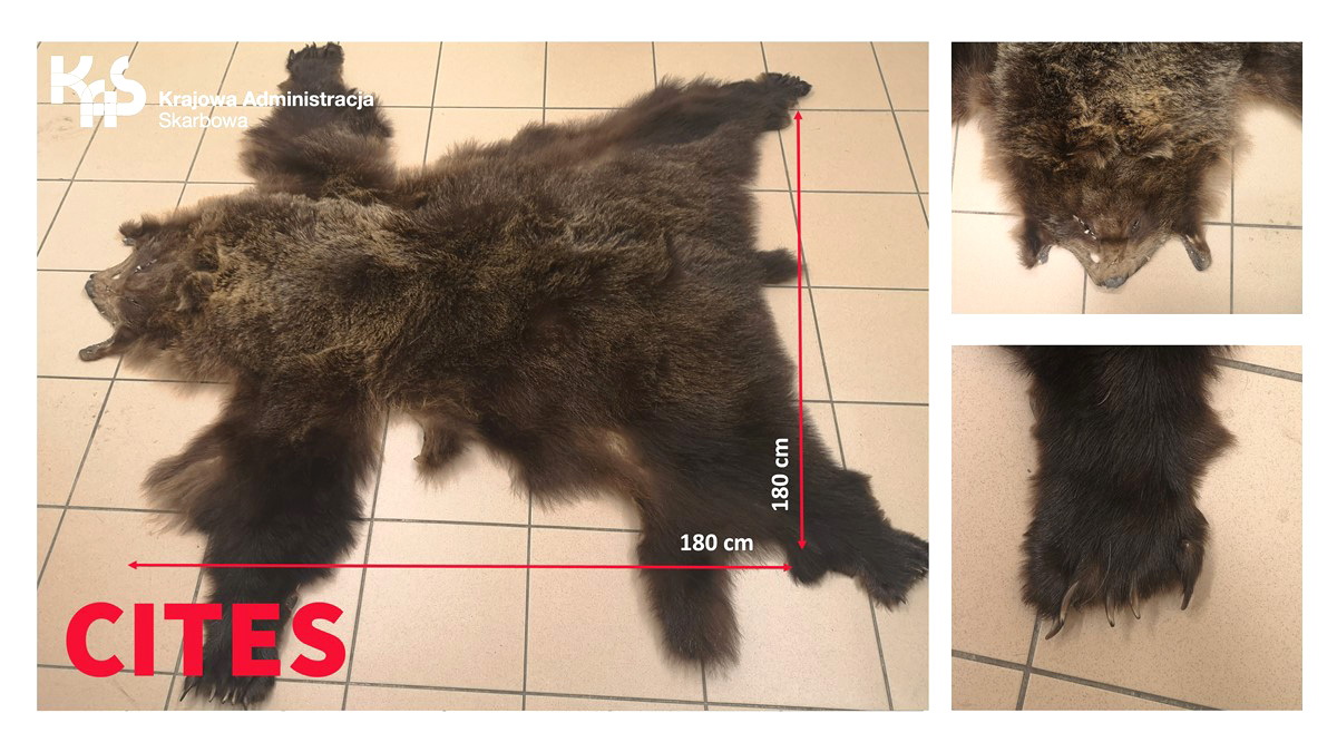 W sierpniu 2022 r. funkcjonariusze KAS z Grzechotek udaremnili przemyt okazu CITES –wyprawionej skóry niedźwiedzia brunatnego. Okaz ukryty był w samochodzie osobowym, którym podróżny jechał z Rosji do Niemiec. Mężczyzna nie zgłosił eksponatu do kontroli. Nie posiadał również żadnych dokumentów, wymaganych podczas przewożenia przez granicę okazów CITES.