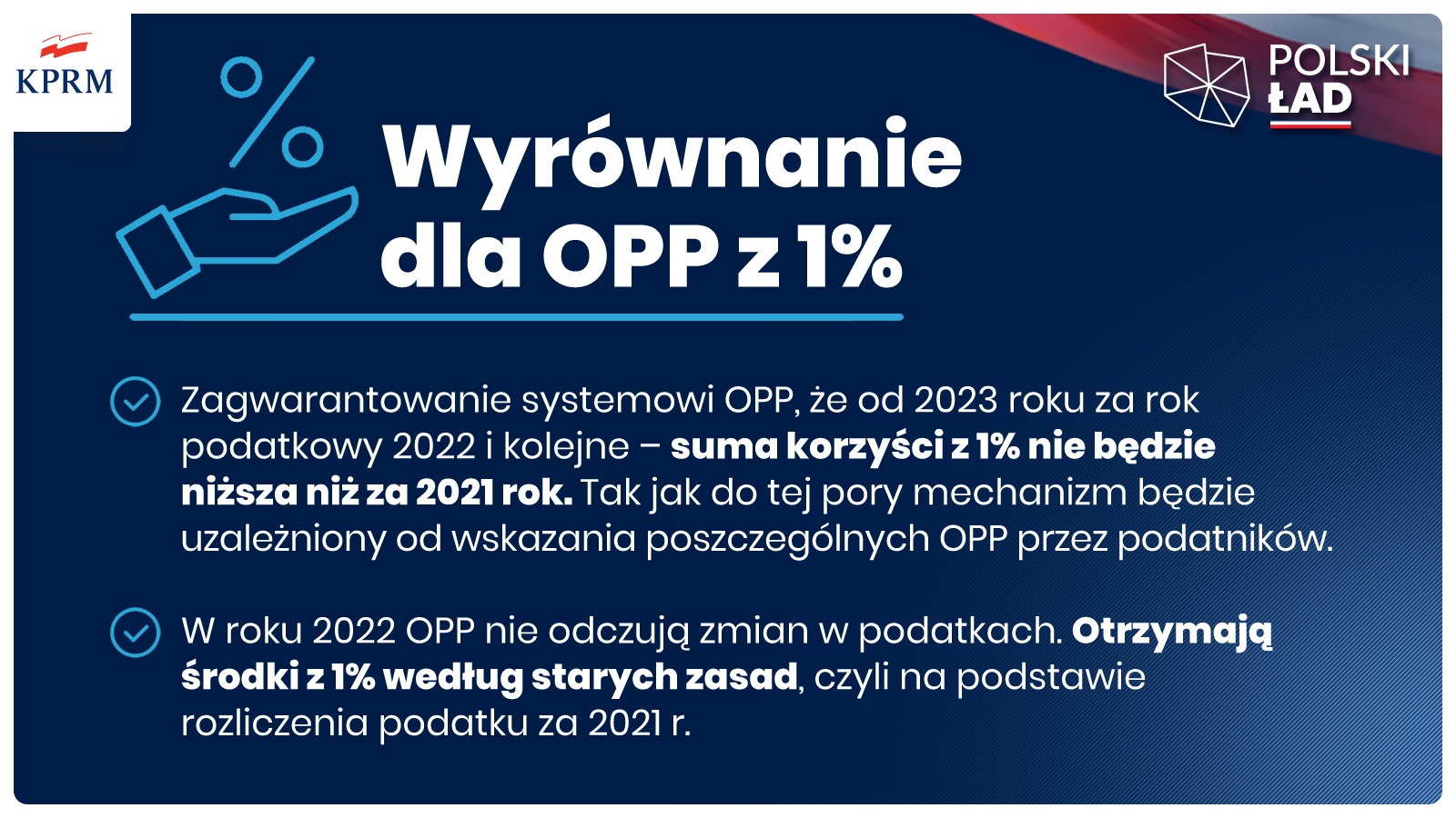 Zabezpieczone zostaną również wpływy Organizacji Pożytku Publicznego (OPP). W tym roku środki z 1 proc. przekazywane będą na podstawie rozliczenia podatku PIT za 2021 r. Tym samym, żadna OPP nie odczuje zmian wynikających z Polskiego Ładu. W 2023 r. wskutek zmian Polskiego Ładu podatki będą znacznie niższe. Środki dla OPP nie będą jednak mniejsze niż obecnie. Różnica wpływów będzie bowiem rekompensowana z budżetu. Jednocześnie rekompensaty uzależnione będą od wskazań samych podatników, a nie arbitralnych decyzji. Na to rozwiązanie przeznaczonych zostanie nawet kilkaset milionów zł.