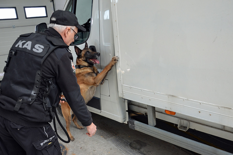- W akcji pomagał owczarek belgijski Bajan wyszkolony do wykrywania tytoniu.