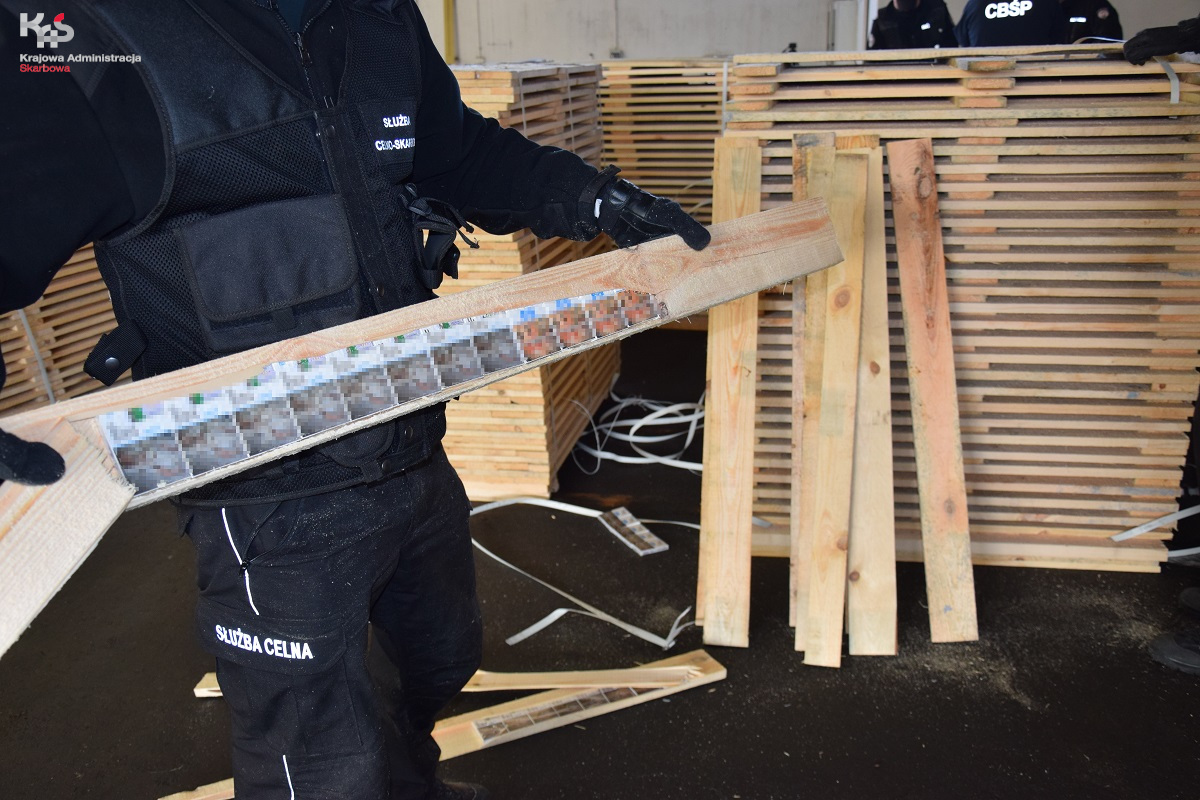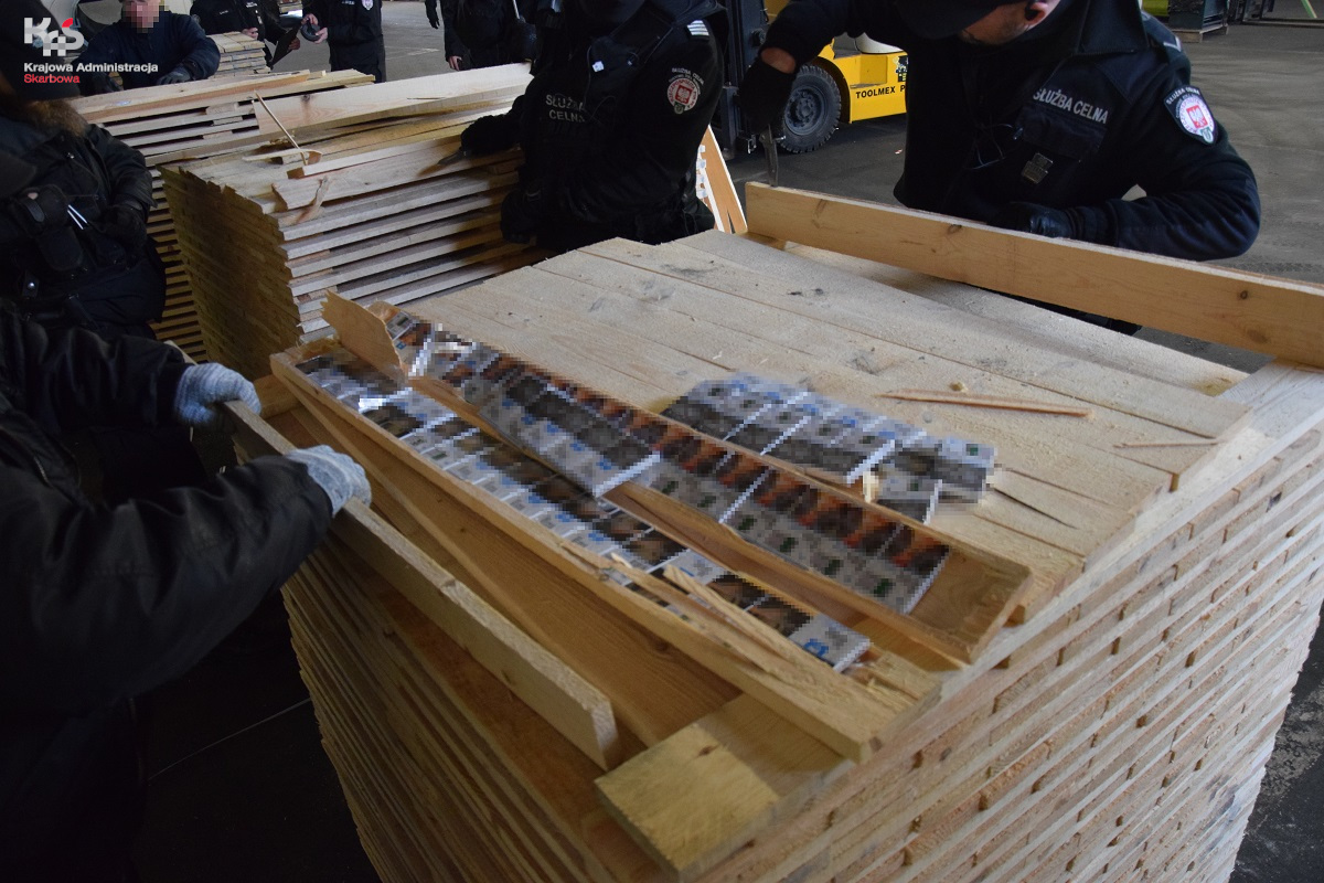 Podczas szczegółowej kontroli stwierdzono, że wewnątrz niektórych specjalnie spreparowanych desek znajdują się paczki z papierosami. Wykryto łącznie 3.192.640 szt. papierosów bez polskich znaków skarbowych akcyzy.