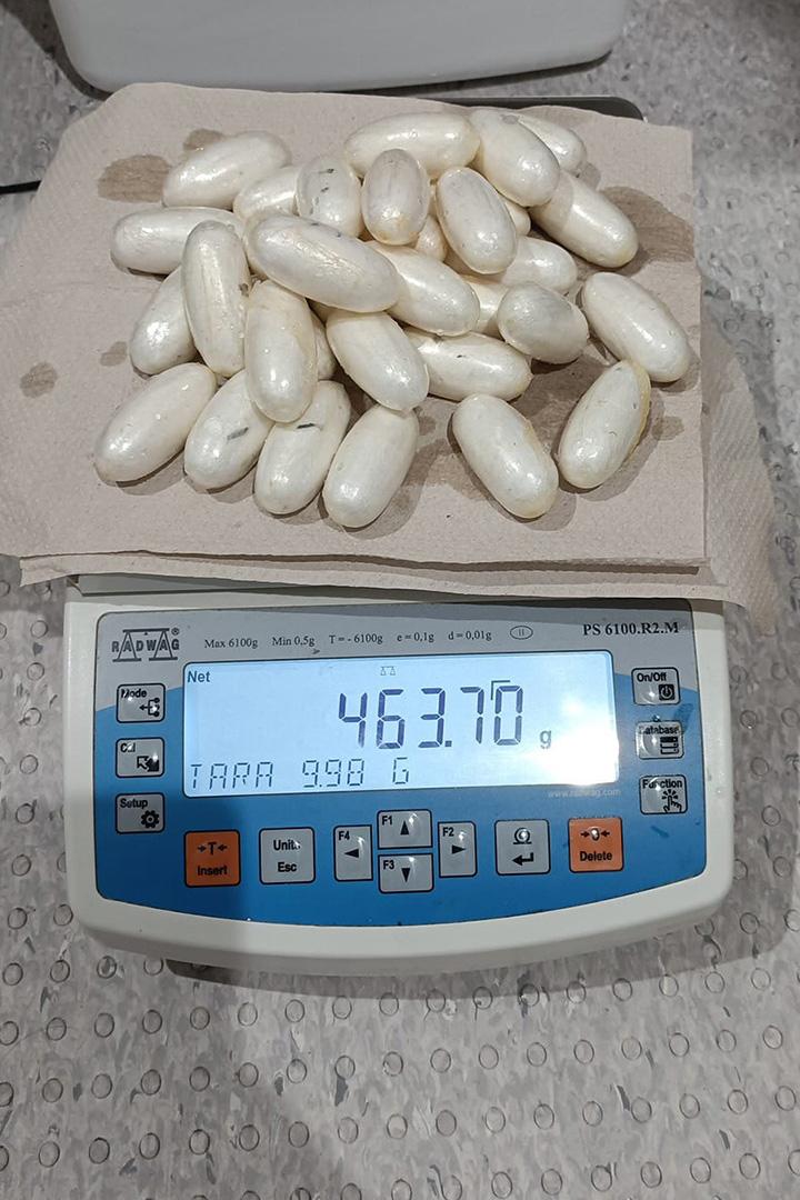 Badania przeprowadzone w Centralnym Laboratorium Celno-Skarbowym w Otwocku potwierdziły, że substancja przemycana w żołądku to kokaina.