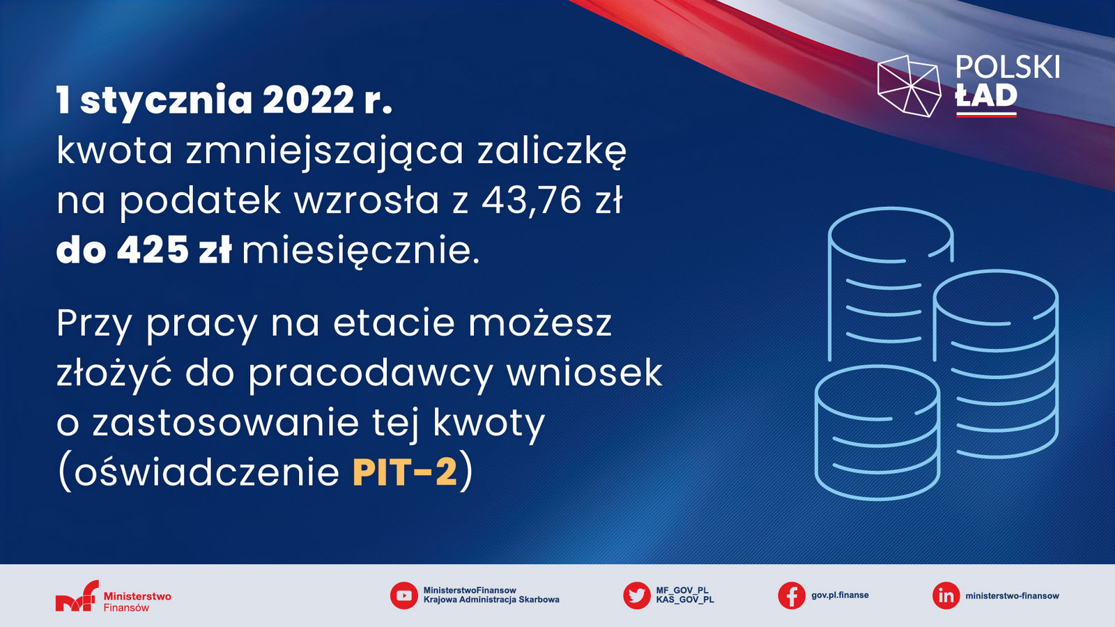 Polski Ład to podwyżka kwoty wolnej do 30 tys. zł (jej odpowiednik to 5100 zł rocznej kwoty zmniejszającej podatek). Wraz z podwyższeniem kwoty wolnej wzrosła też kwota zmniejszająca zaliczki na podatek. Jeszcze w zeszłym roku wynosiła ona 43,76 zł miesięcznie. Od 1 stycznia 2022 r. wynosi niemal 10 razy więcej – czyli 425 zł (1/12 z 5100 zł).