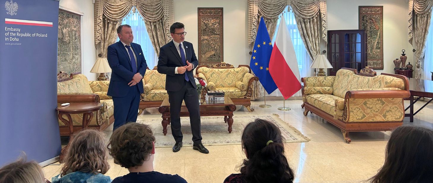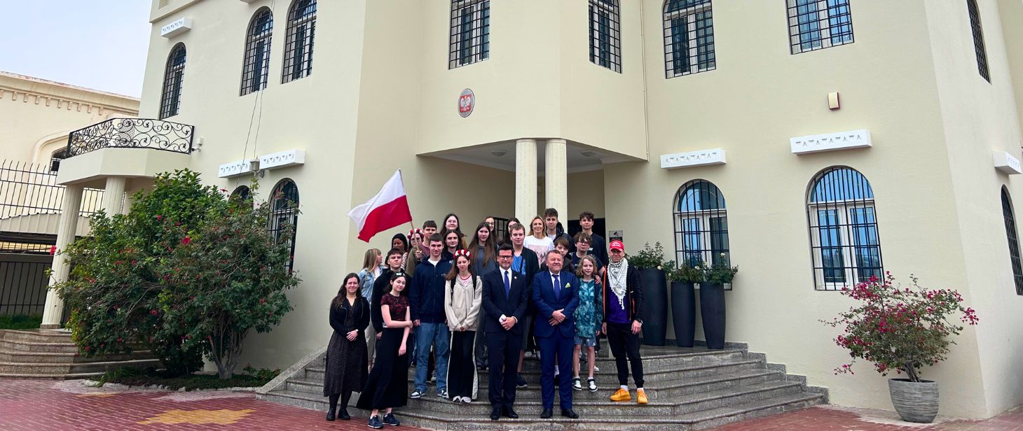 W dn. 18 lutego 2025 r. w siedzibie Ambasady RP w Katarze mieliśmy przyjemność gościć uczniów i kadrę pedagogiczną reprezentujących Szkołę Podstawową im. B. Chrobrego w Żórawinie, Liceum Ogólnokształcące nr V im. J.Jasińskiego we Wrocławiu, a także I Liceum Ogólnokształcące im. A Mickiewicza w Białymstoku.