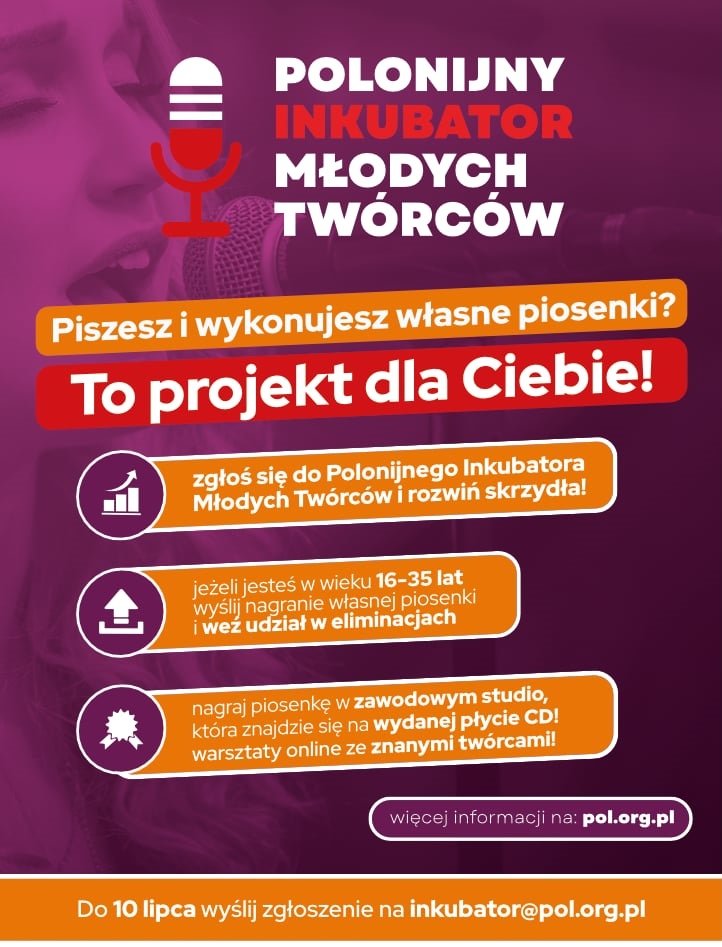 Polonijny Inkubator Młodych Twórców to innowacyjny projekt mający na celu promowanie pisania polskich piosenek wśród młodych osób z Polonii na całym świecie. Dzięki udziałowi w warsztatach online oraz wsparciu wybitnych polskich twórców, uczestnicy będą mogli rozwijać swoje umiejętności artystyczne oraz dokonać nagrania w renomowanym studio w Polsce!