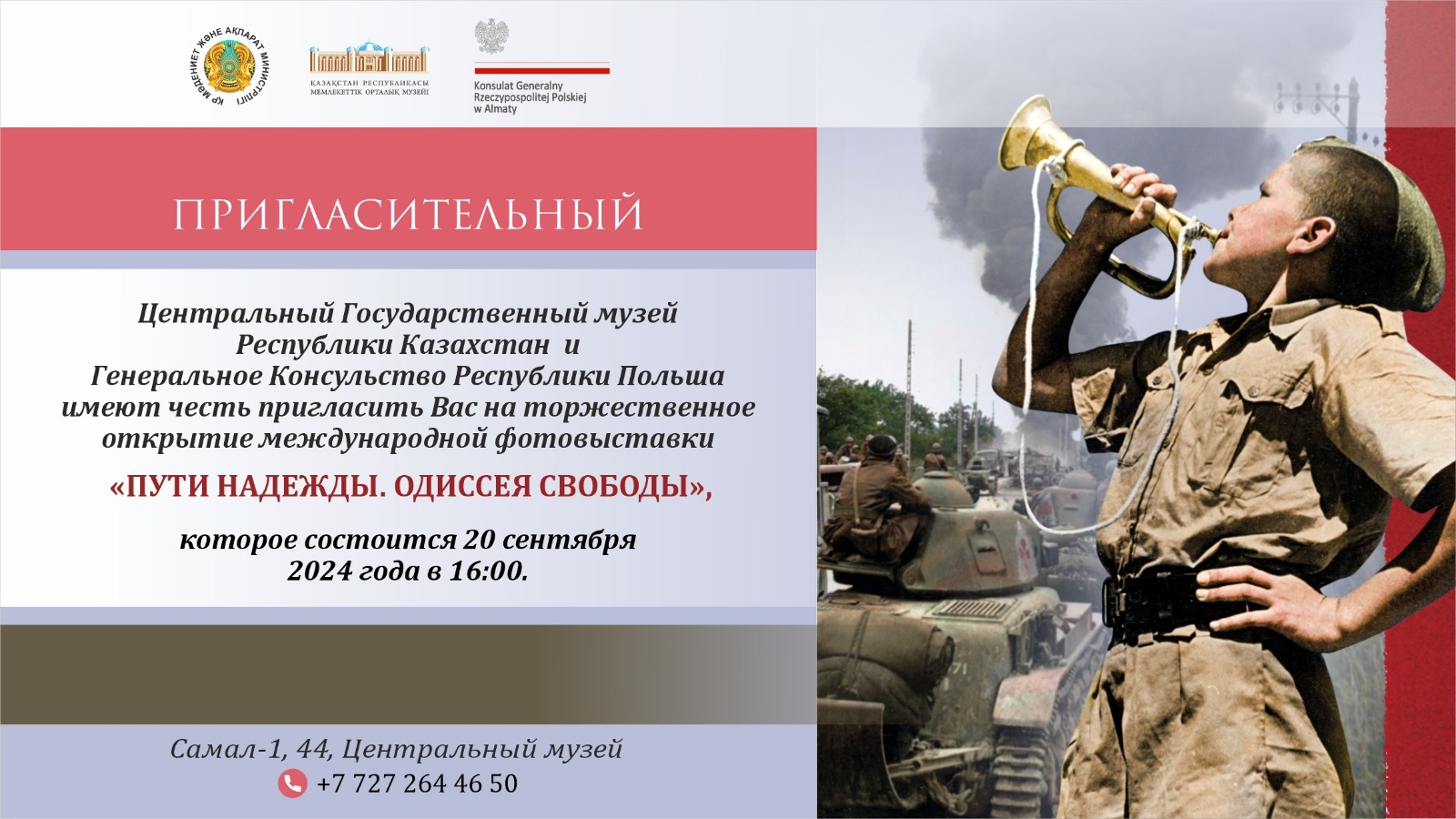 W dniach 20 – 30 września 2024 r. w Centralne Państwowe Muzeum Kazachstanu w Ałmaty we współpracy z Konsulatem Generalnym RP w Ałmaty zostanie zaprezentowana wystawa Instytutu Pamięci Narodowej „Szlaki Nadziei. Odyseja Wolności”, która ma na celu upamiętnienie wysiłku Polskich Sił Zbrojnych podczas II wojny światowej oraz losy ludności cywilnej ewakuowanej z ZSRR wraz z armią gen. Andersa.