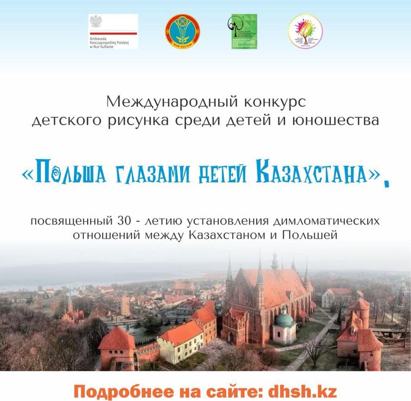 По случаю 30-летия установления дипломатических отношений между Республикой Польша и Республикой Казахстан Детская художественная школа-клуб ЮНЕСКО г. Нур-Султан совместно с Посольством Республики Польша в Нур-Султане, при поддержке Управления образования г. Нур-Султан, объявляют Конкурс детского рисунка среди детей и юношества «Польша глазами детей Казахстана»