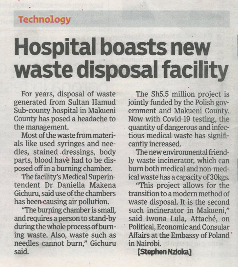 Ambasada RP w Nairobi w ramach programu Małych Grantów sfinansowała w 2020 r. inicjatywę pn. Gospodarka odpadami medycznymi w Sultan Hamud Subcounty Hospital w hrabstwie Makueni, w ramach której kwotę 30 000 euro przeznaczyliśmy na zakup i montaż nowoczesnej, ekologicznej spalarni śmieci dla szpitala Sultan Hamud Subcounty Hospital w kenijskim hrabstwie Makueni.