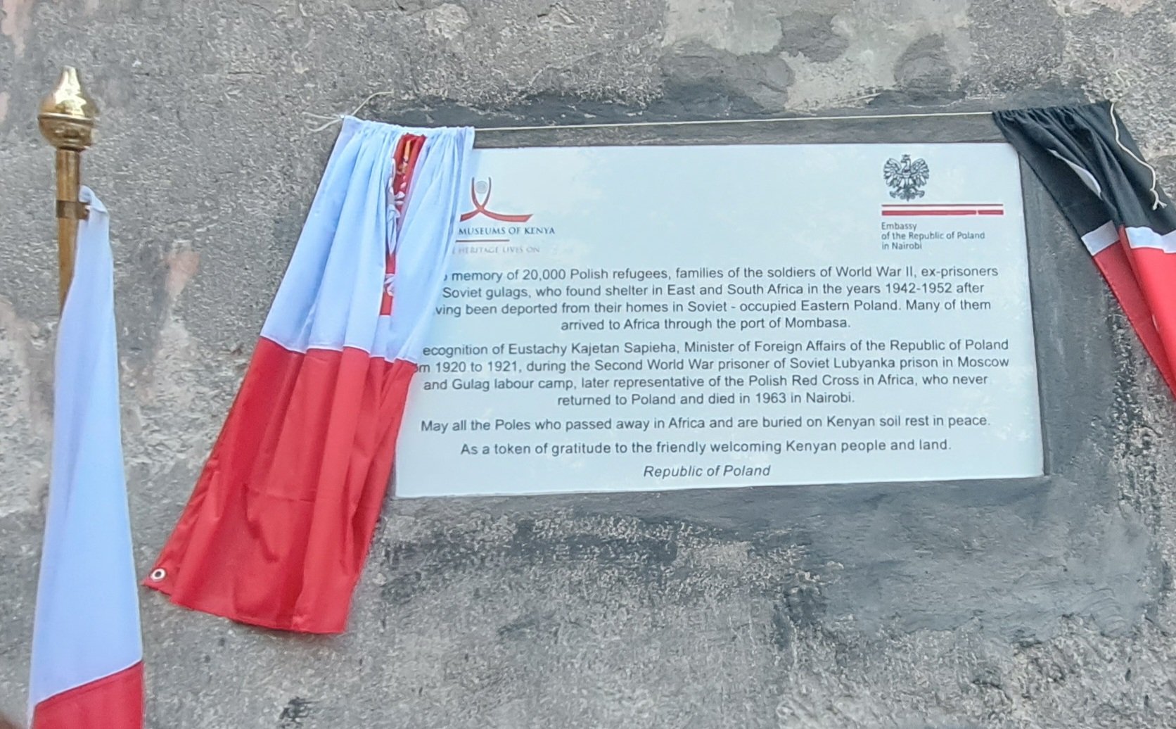On November 16, 2022, in Fort Jesus in Mombasa, a plaque commemorating the arrival of Polish refugees to Africa in 1942 and Eustachy Sapieha, former Minister of Foreign Affairs in 1920-1921 and Polish Red Cross representative for East Africa during World War II, was unveiled. A temporary exhibition entitled "Poles in Africa 1942-1952", prepared by the Embassy on the basis of iconographic materials from the Center for Deportations, Expulsions and Resettlements of the Pedagogical University in Crakow was also opened.
