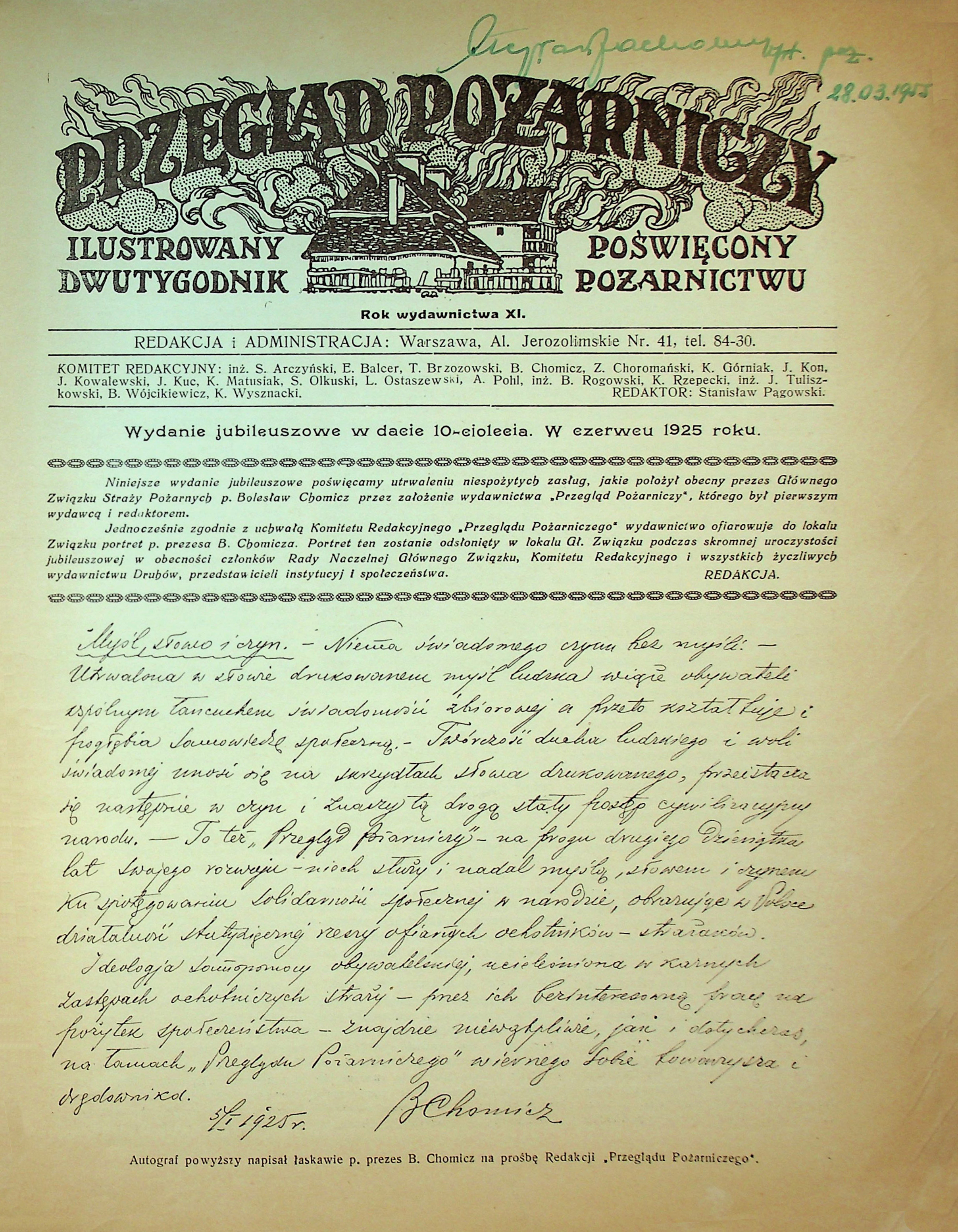 Wysoki PP zawdzięczał dwóm wielkim postaciom polskiej ochrony przeciwpożarowej – redaktorowi naczelnemu Bolesławowi Chomiczowi i kierownikowi działu technicznego Józefowi Tuliszkowskiemu. Pierwszy z nich zadbał o ujęcie na łamach czasopisma kwestii pożarnictwa, budownictwa ogniotrwałego i ubezpieczeń, a drugi zagadnień z dziedziny techniki i taktyki pożarniczej.