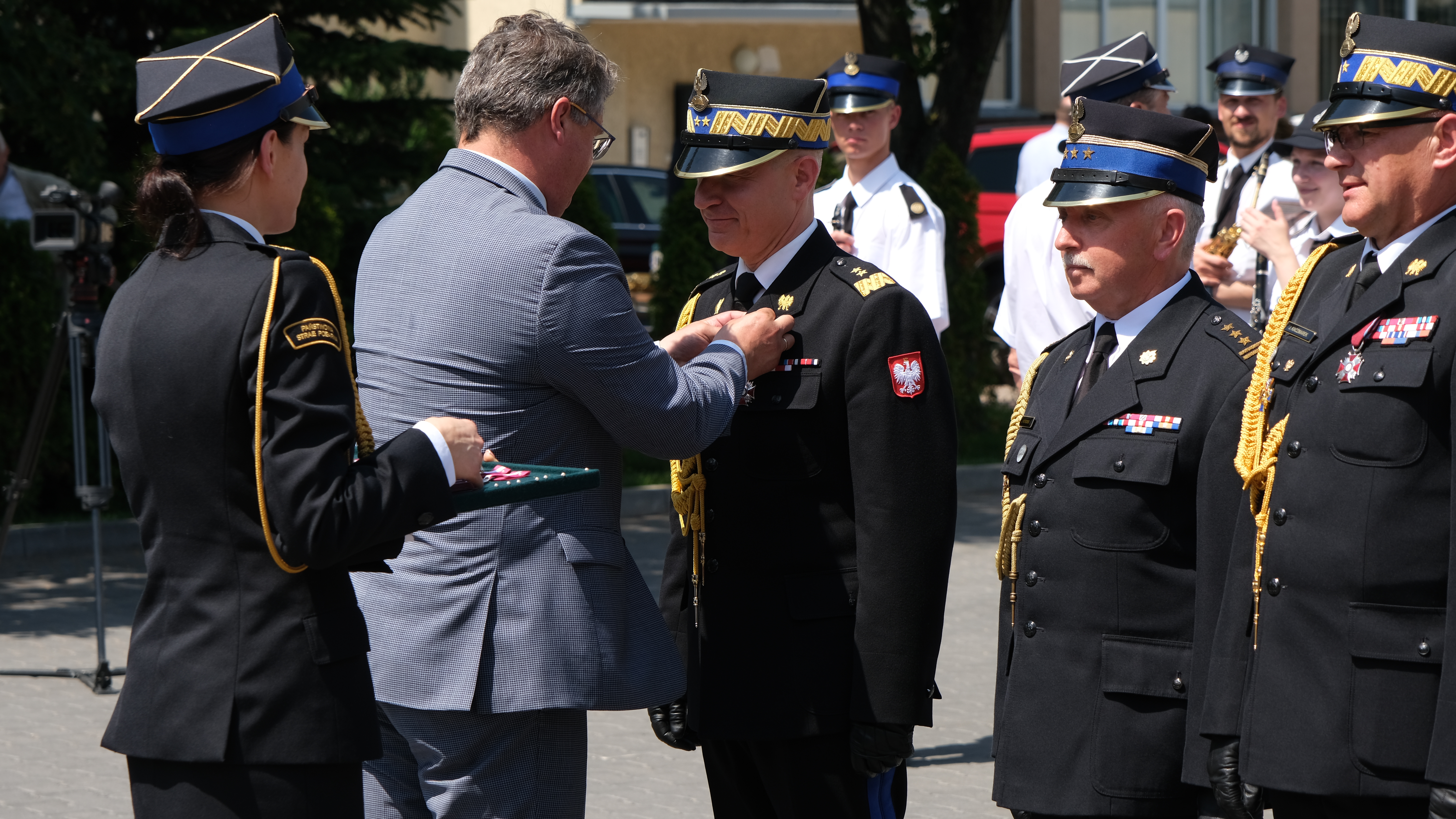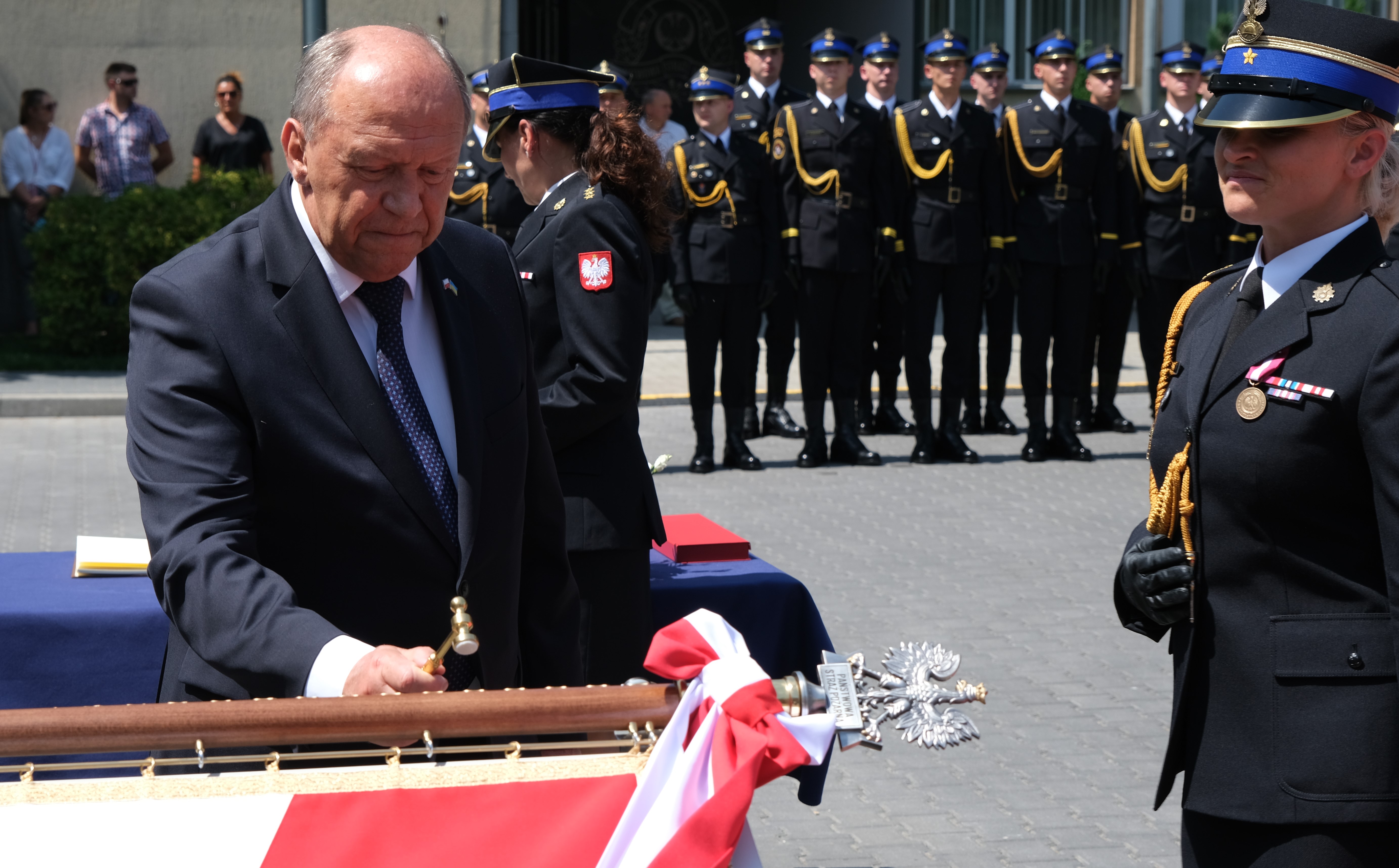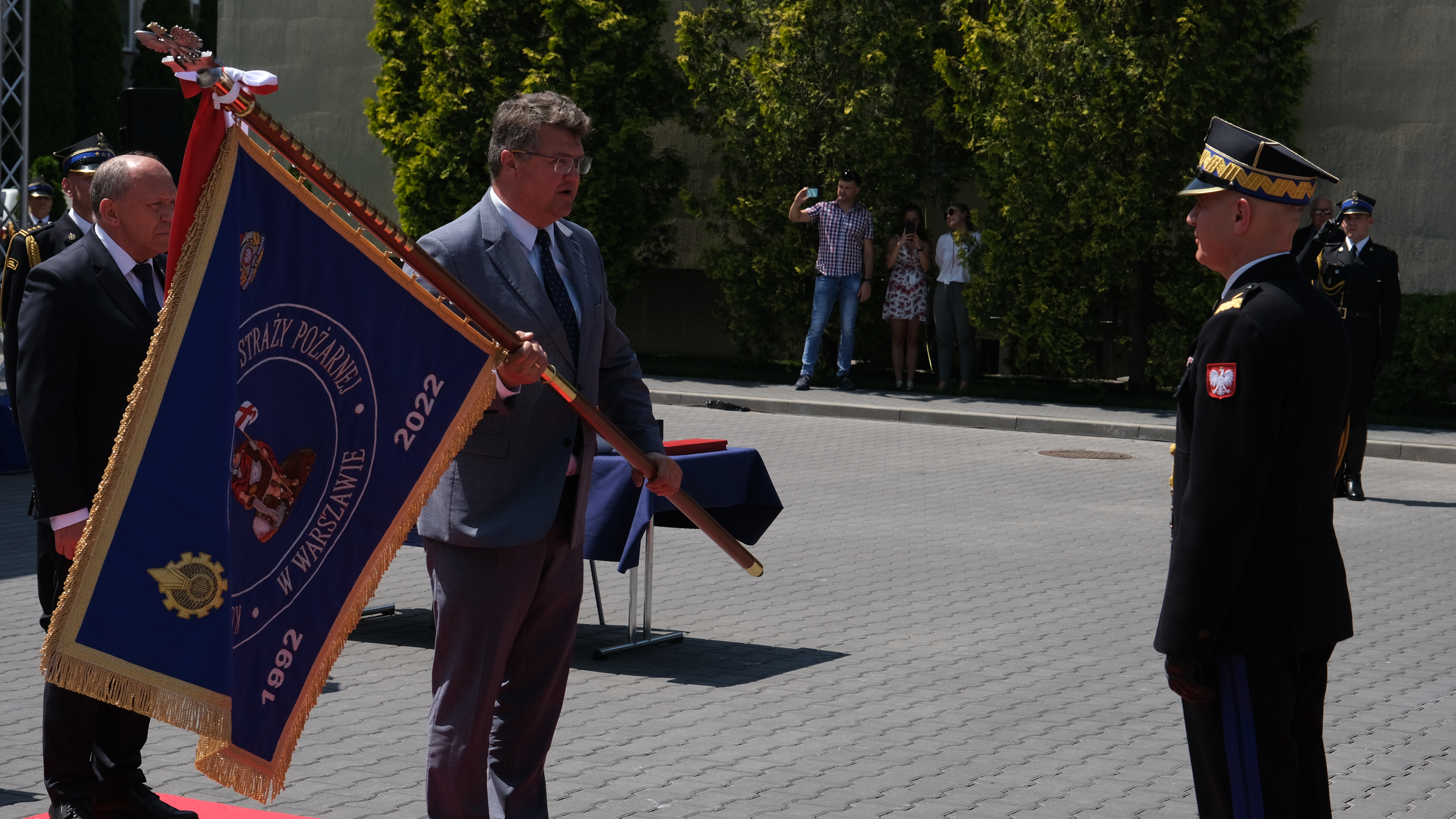 „Wręczam Komendzie Głównej Państwowej Straży Pożarnej sztandar ufundowany przez społeczeństwo i środowisko pożarnicze”.