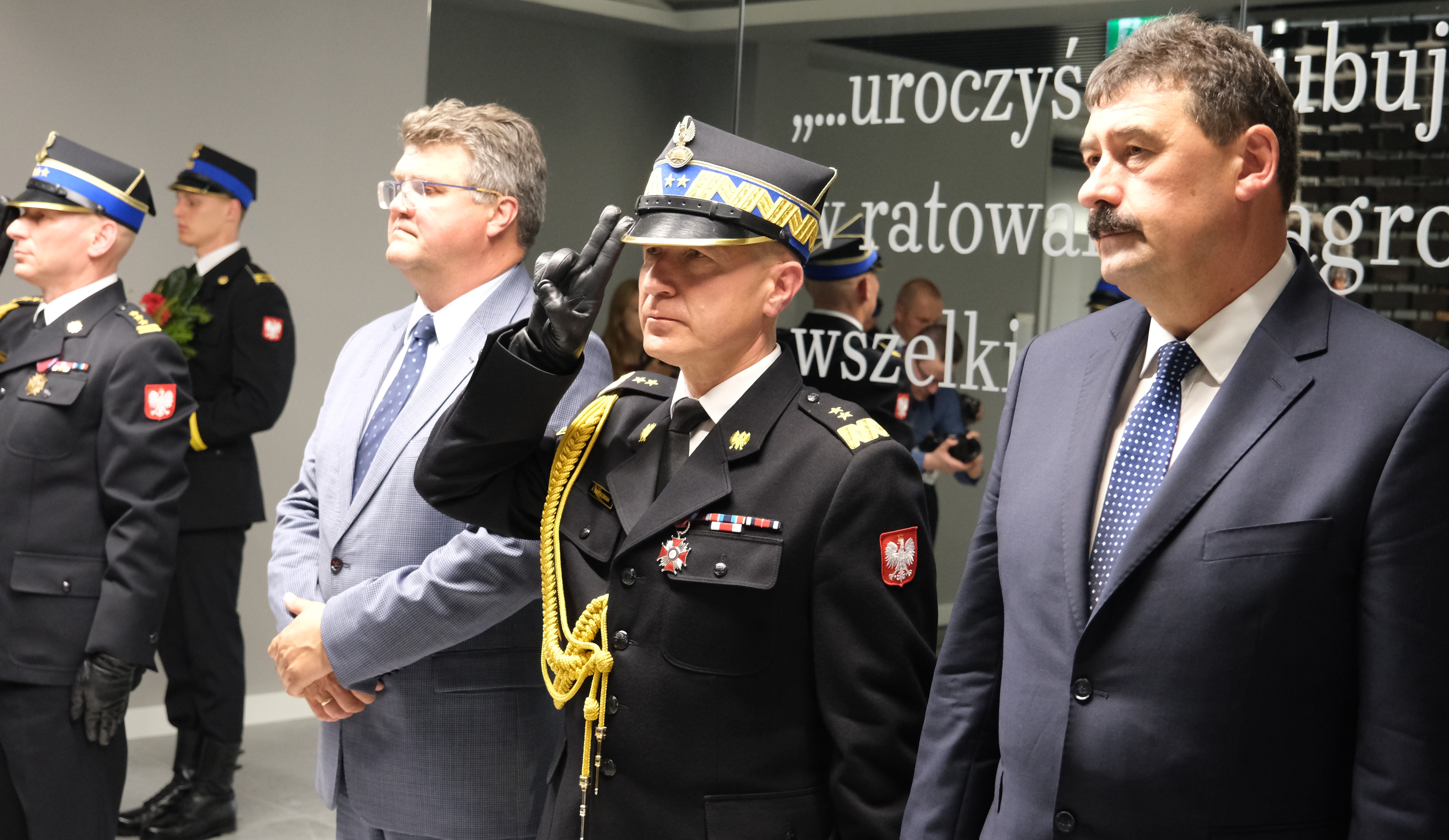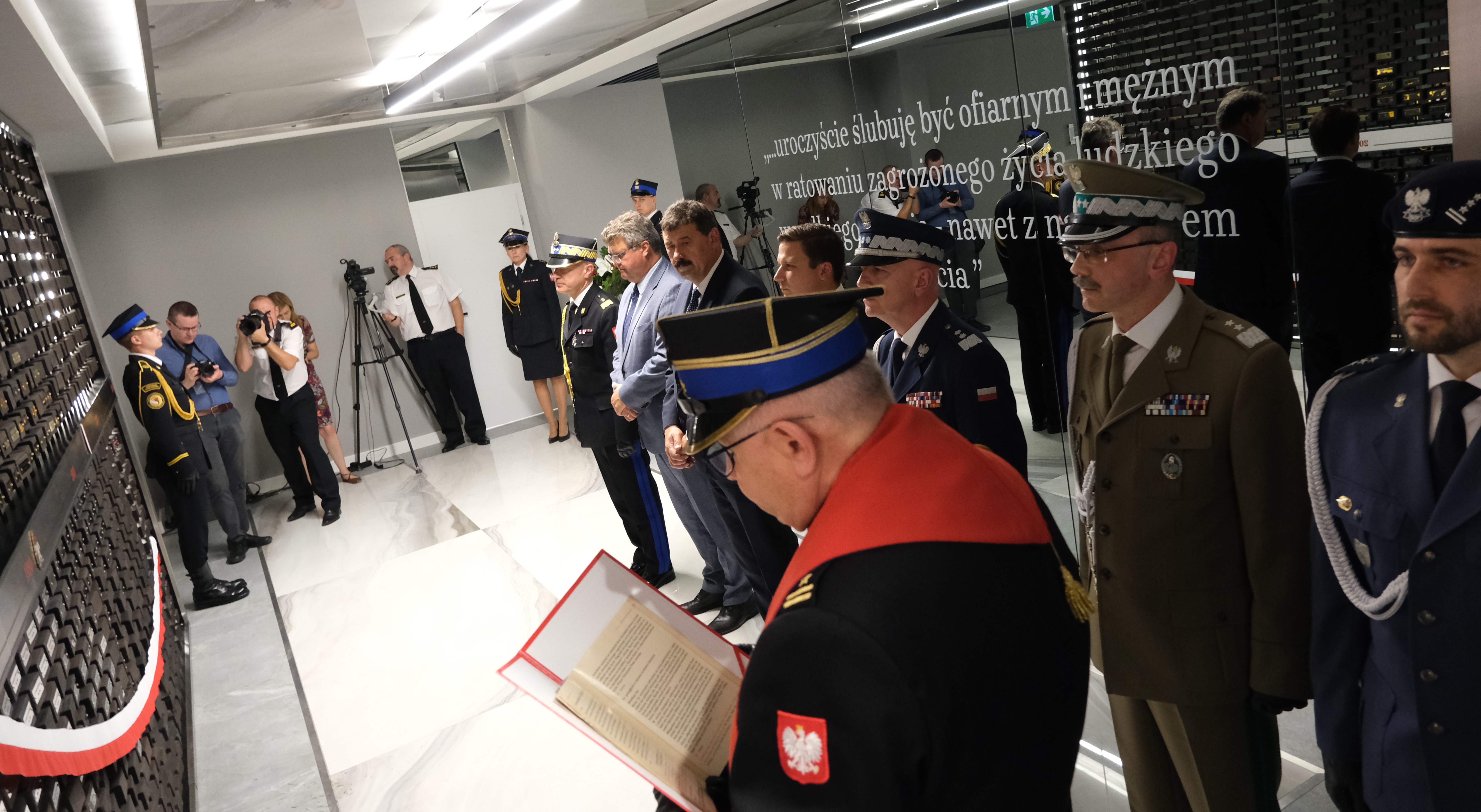 „Dzisiaj będziemy odsłaniać Ścianę Pamięci - Ścianę Pamięci ludzi, którzy wypełnili rotę ślubowania do samego końca. Są tam nazwiska Ochotniczych Straży Pożarnych, Państwowej Straży Pożarnej i Zawodowej Straży Pożarnej – wszyscy razem do akcji i wszyscy razem „po drugiej stronie”. Odsłonimy tę ścianę, żeby Ich upamiętnić …” – podkreślił gen. brygadier Andrzej Bartkowiak, po czym wspólnie z sekretarzem stanu w Ministerstwie Spraw Wewnętrznych i Administracji Panem Maciejem Wąsikiem, sekretarzem stanu w Ministerstwie Rolnictwa i Rozwoju Wsi Panem Ryszardem Bartosikiem, szefami służb Policji, Straży Granicznej oraz Służby Ochrony Państwa oraz zastępcą szefa Kancelarii Sejmu Panem Christianem Młynarkiem, dokonali uroczystego odsłonięcia Ściany, znajdującej się w holu budynku Komendy Głównej PSP.