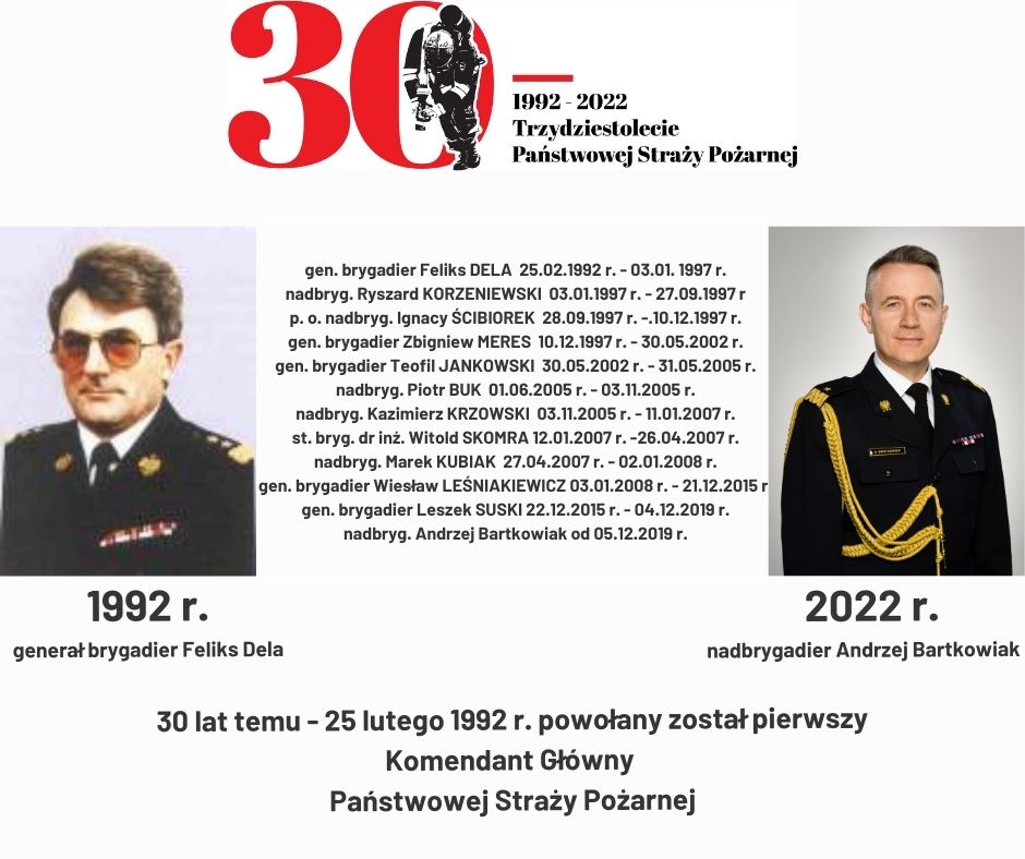 30 lat temu - 25 lutego 1992 roku powołany został pierwszy komendant główny Państwowej Straży Pożarnej – został nim generał brygadier Feliks Dela. Stał się jednocześnie pierwszym funkcjonariuszem Państwowej Straży Pożarnej.