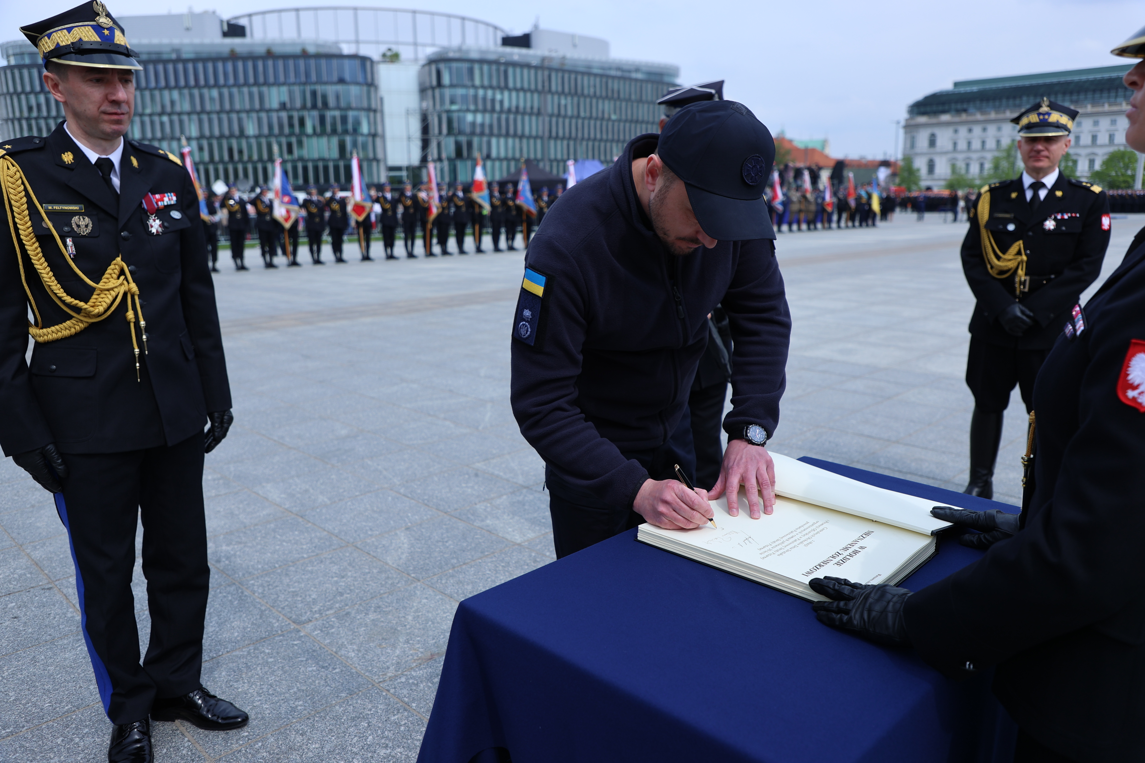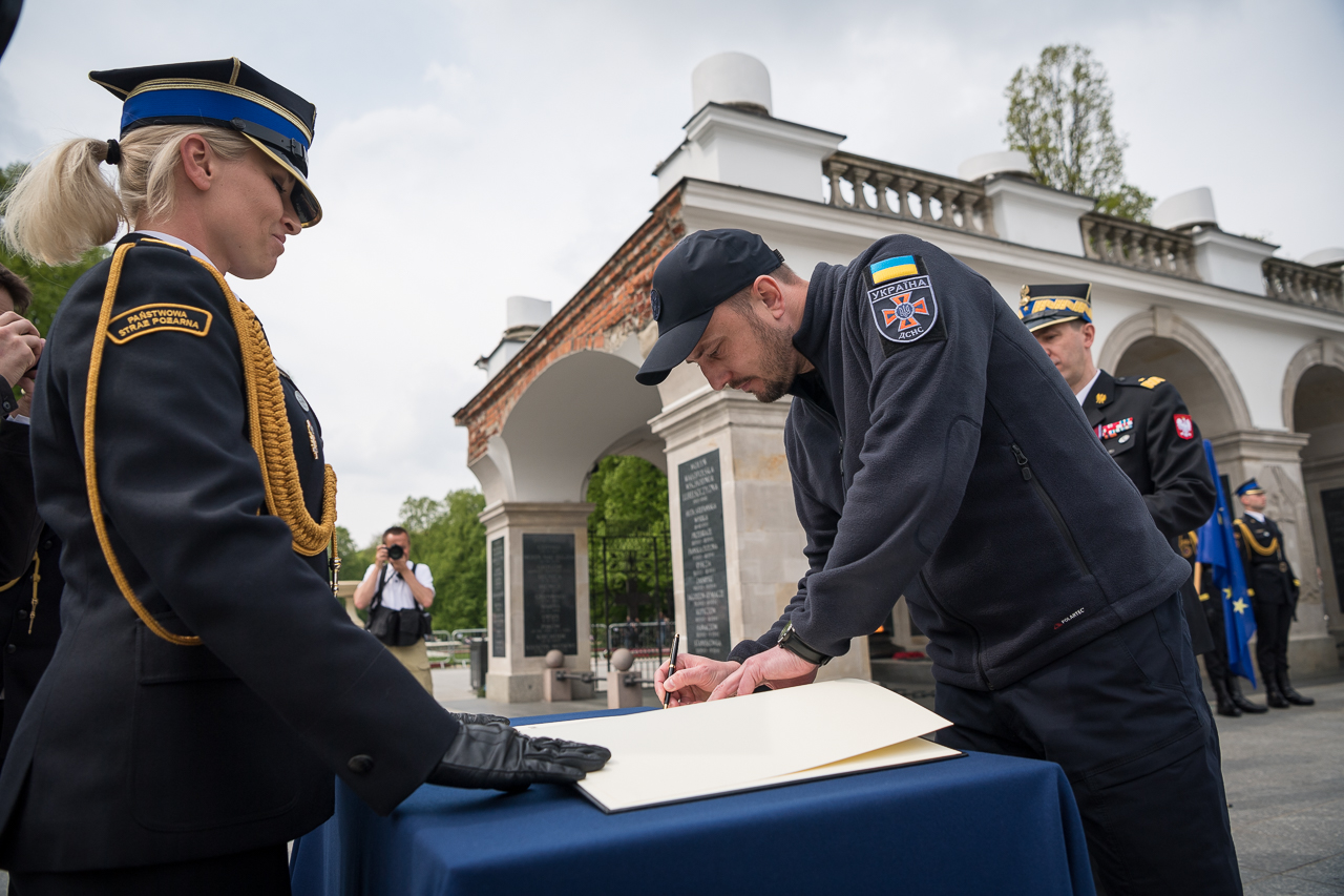 "Mam dzisiaj wielki zaszczyt i doskonałą okazję podziękować wolnemu narodowi polskiemu, kierownictwu Państwa polskiego, kierownictwu Państwowej Straży Pożarnej oraz wszystkim funkcjonariuszom PSP i druhom ochotnikom za natychmiastowe i wymierne wsparcie od pierwszych dni wojny, za pomoc milionom Ukraińców, którzy znaleźli schronienie w Polsce oraz tym, którzy uczestniczą w dzisiejszej uroczystości. Braterstwo straży pożarnej nie ma granic i właśnie dlatego jestem tutaj obecny, abym mógł złożyć życzenia moim polskim kolegom z okazji Międzynarodowego Dnia Strażaka i 30-lecia powołania Państwowej Straży Pożarnej."