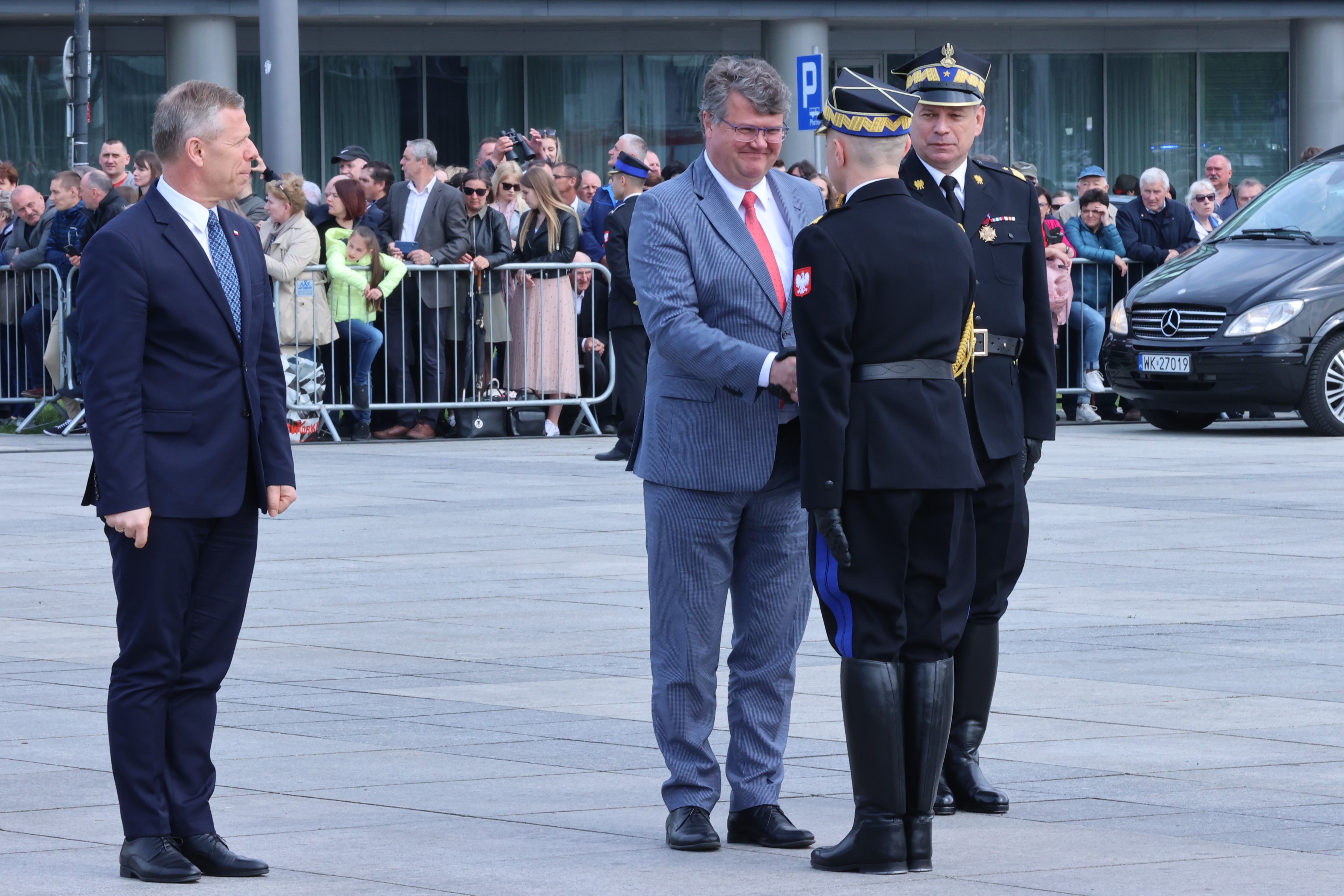 Komendant Główny PSP przywitał przybyłych na uroczystość gości: Prezydenta RP Andrzeja Dudę, Pierwszą Damę Agatę Kornhauser - Duda, Wicemarszałka Sejmu Piotra Zgorzelskiego, Sekretarza Stanu w Ministerstwie Spraw Wewnętrznych i Administracji Macieja Wąsika wraz z Ministrami resortu SWiA, Ambasadora Grecji w Polsce Michaiła-Efstratiosa C. Daratzikisa , Parlamentarzystów na czele z Posłem Zbigniewem Chmielowcem Przewodniczącym Parlamentarnego Zespołu Strażaków, przedstawicieli Rządu - Ministrów, Sekretarzy i Podsekretarzy Stanu, Sekretarza Stanu Zastępcę Szefa Kancelarii Prezesa Rady Ministrów Zbigniewa Hoffmana, Szefa Kancelarii Senatu Adama Niemczewskiego, Szefa Biura Bezpieczeństwa Narodowego Pawła Solocha, przedstawicieli Wojska Polskiego oraz Szefów służb mundurowych podległych MSWiA, przedstawicieli władz rządowych i samorządowych, Prezesa Zarządu Głównego ZOSP RP Waldemara Pawlaka oraz wszystkich pozostałych uczestników uroczystości.