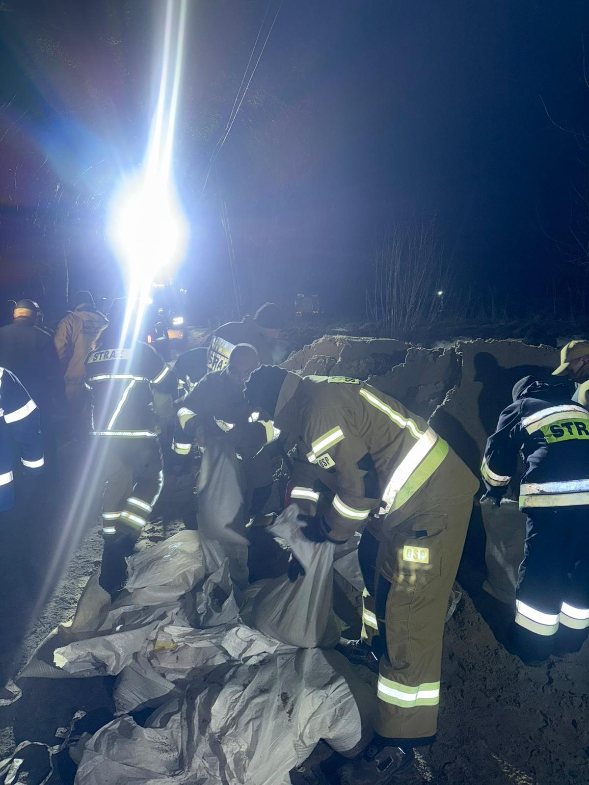 W akcji ratunkowej w Błędowie w czwartek na g. 21.00 brało udział 18 zastępów Straży Pożarnej w liczbie 65 funkcjonariuszy w terenie. Działania skupiają się na budowie wałów ochronnych z wykorzystaniem worków oraz specjalistycznych rękawów wypełnionych piaskiem. Strażacy nie tylko zabezpieczają posesje przed wdarciem się wody, ale również prowadzą skomplikowaną operację ukierunkowywania rozlewiska z powrotem do koryta rzeki, co ma na celu odciążenie zalanych obszarów.