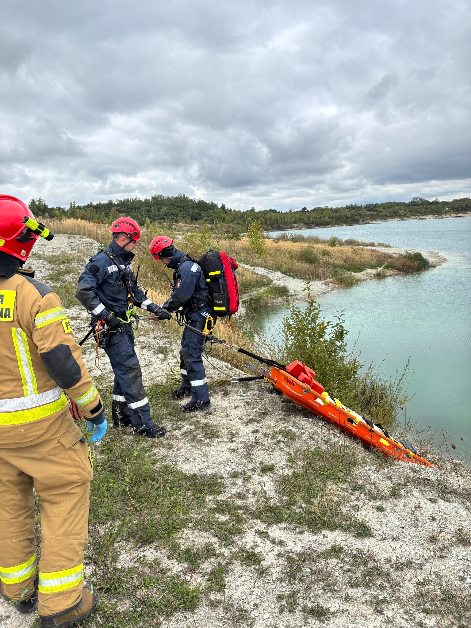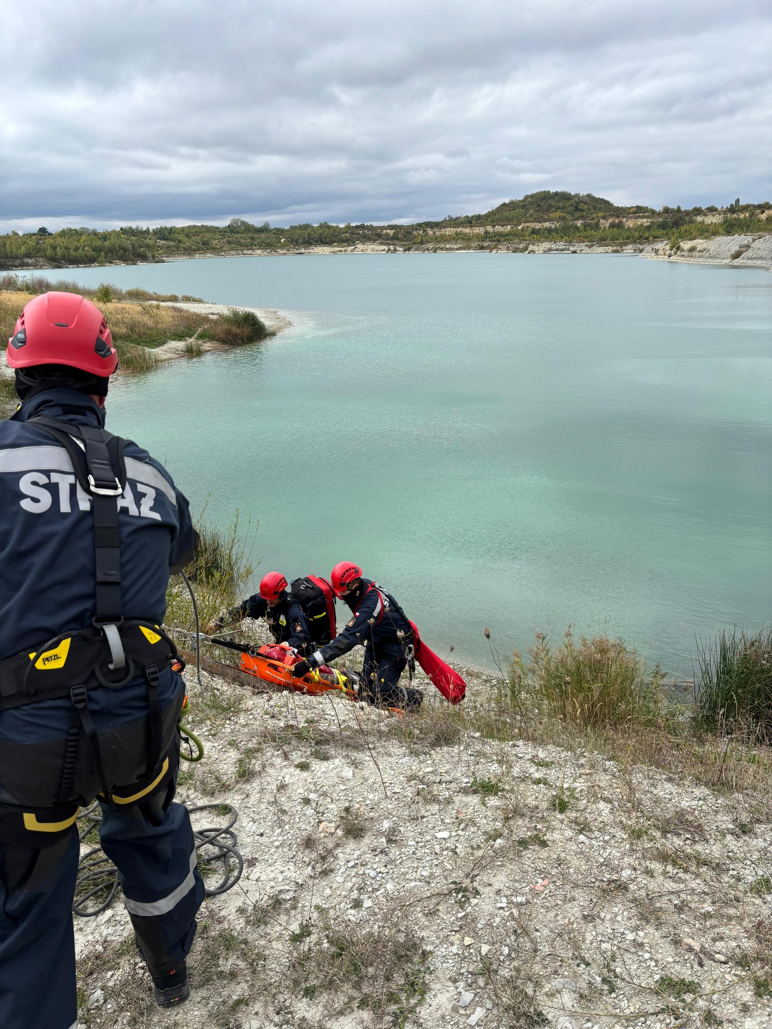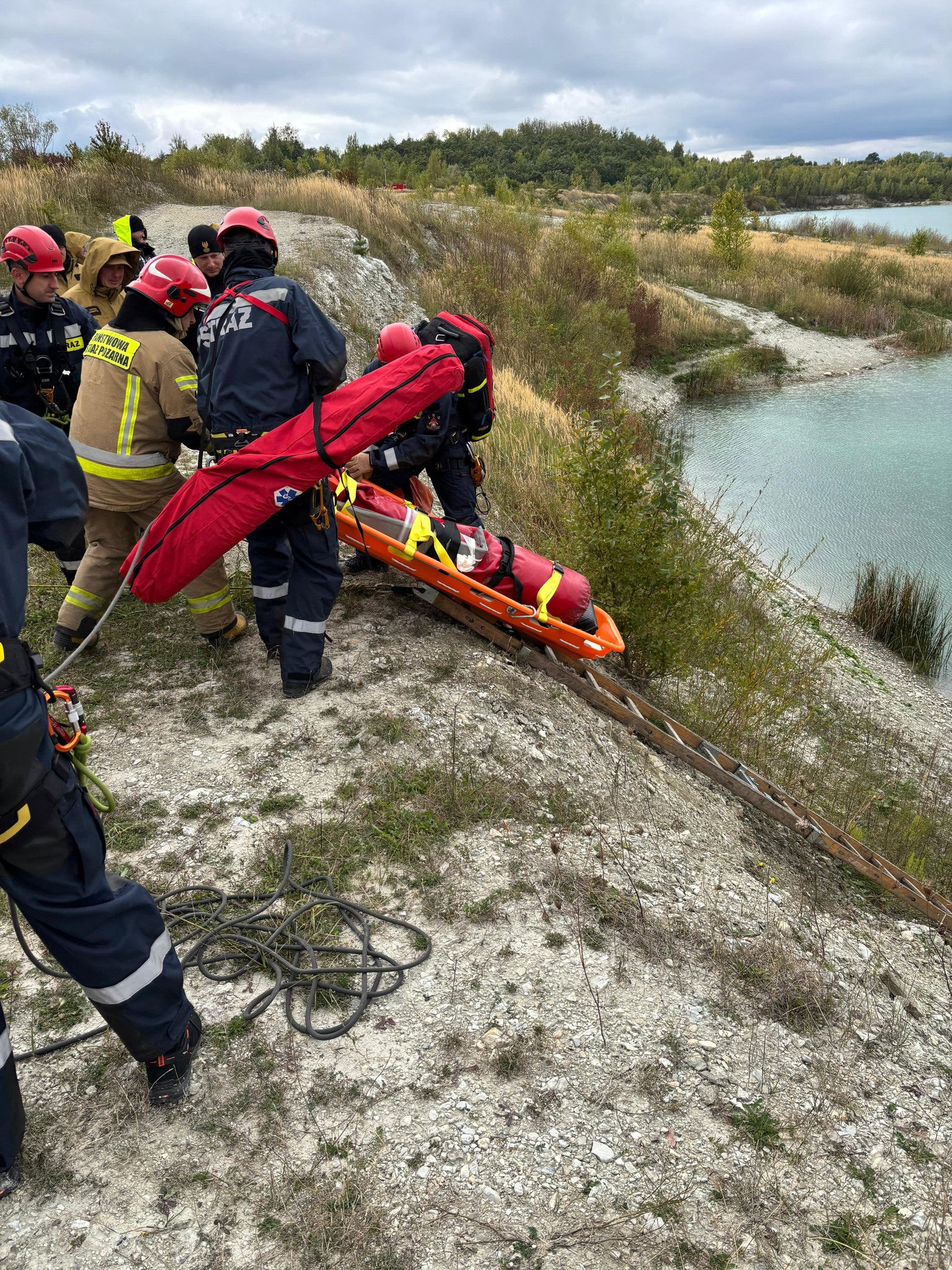 - Ratownictwo wysokościowe – osunięcie się ziemi skarpy spowodowało upadek spacerującej osoby, która zatrzymała się nad brzegiem zbiornika wodnego.