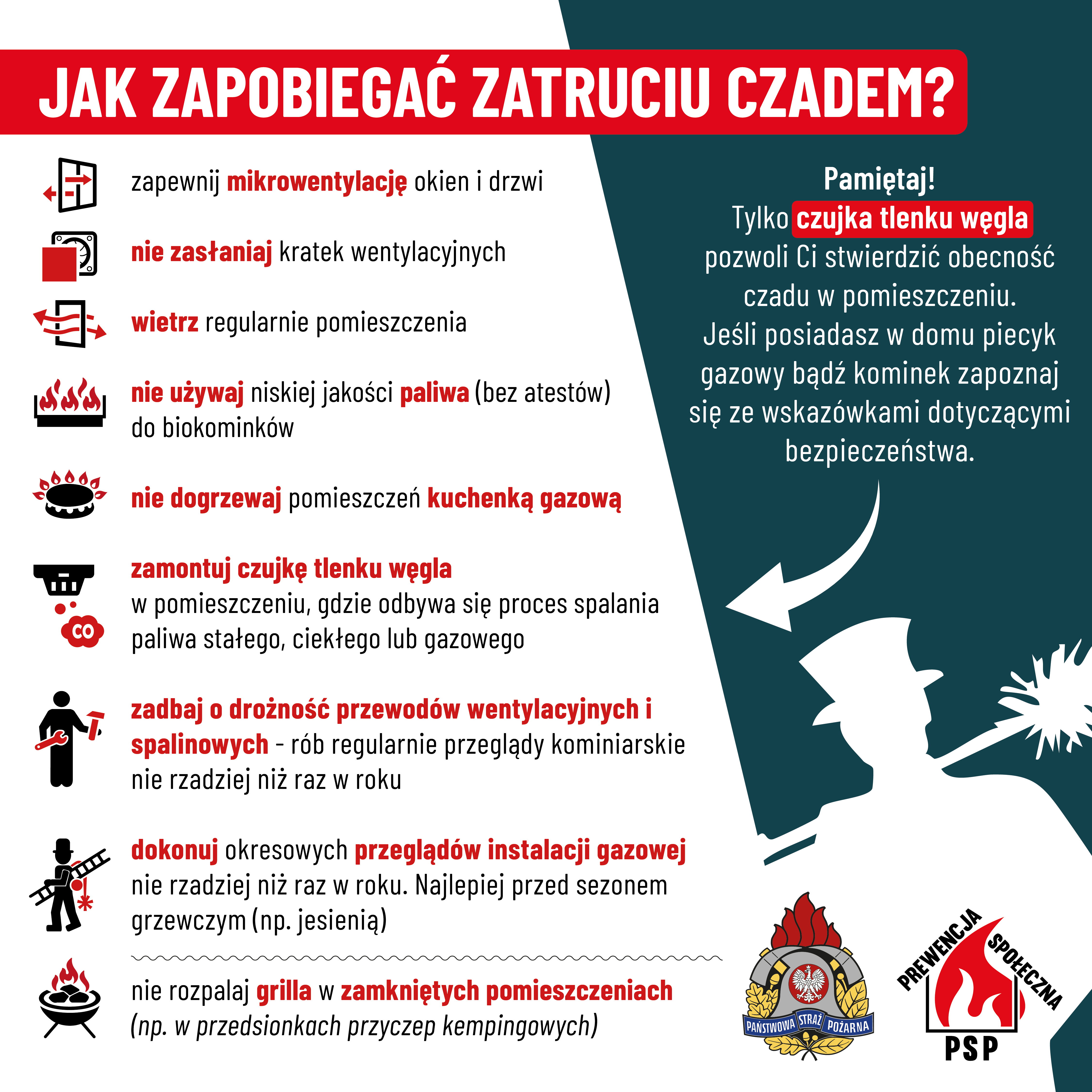 - Państwowa Straż Pożarna zwraca uwagę na fakt, że autonomiczna czujka tlenku węgla nie zastępuje przeglądu technicznego przewodów wentylacyjnych i kominowych.