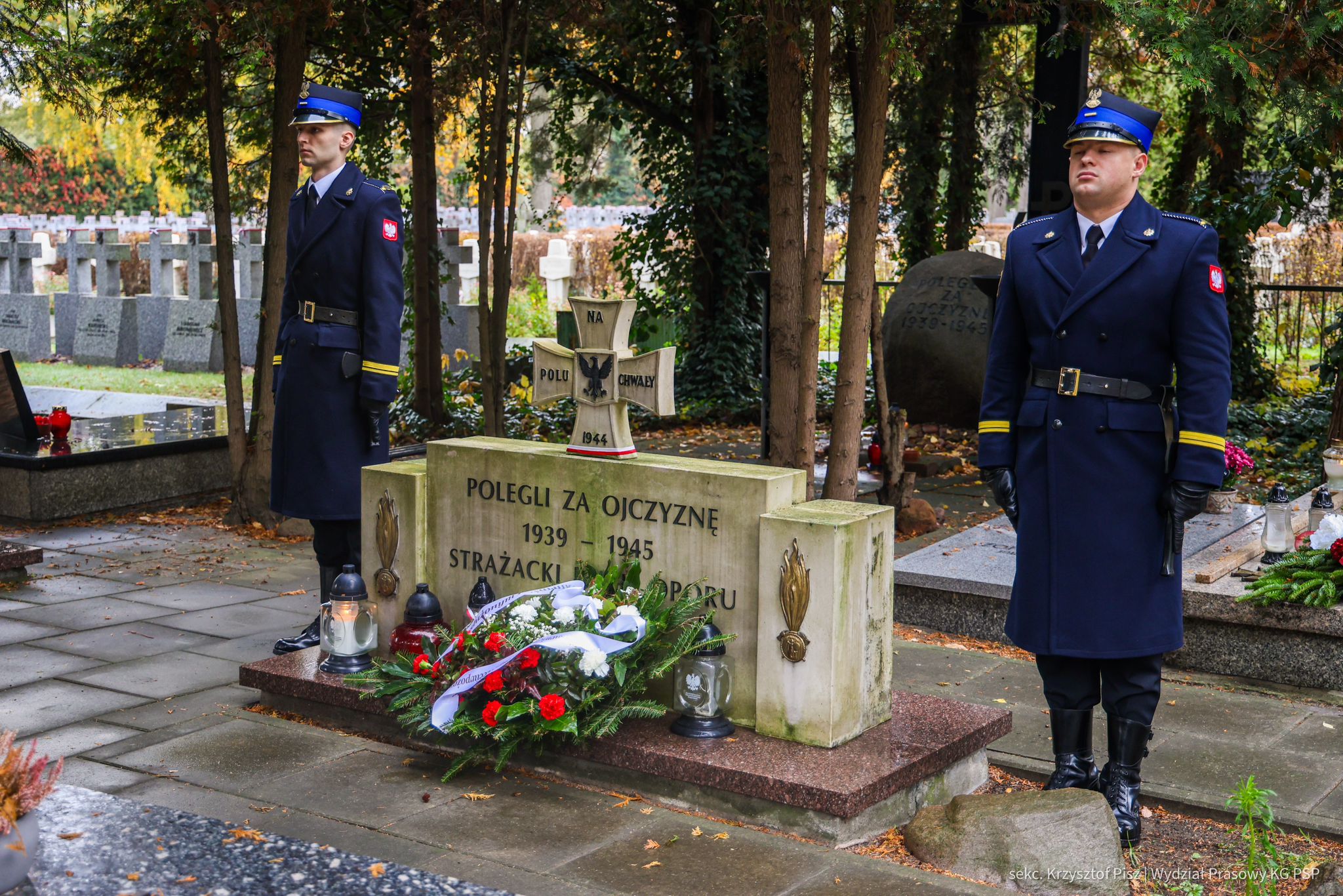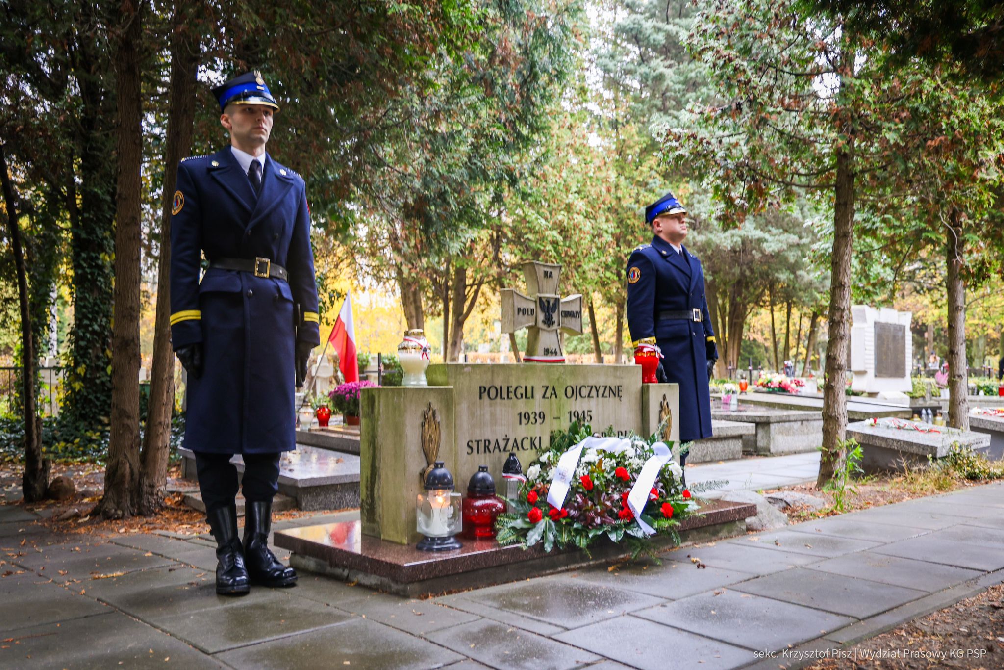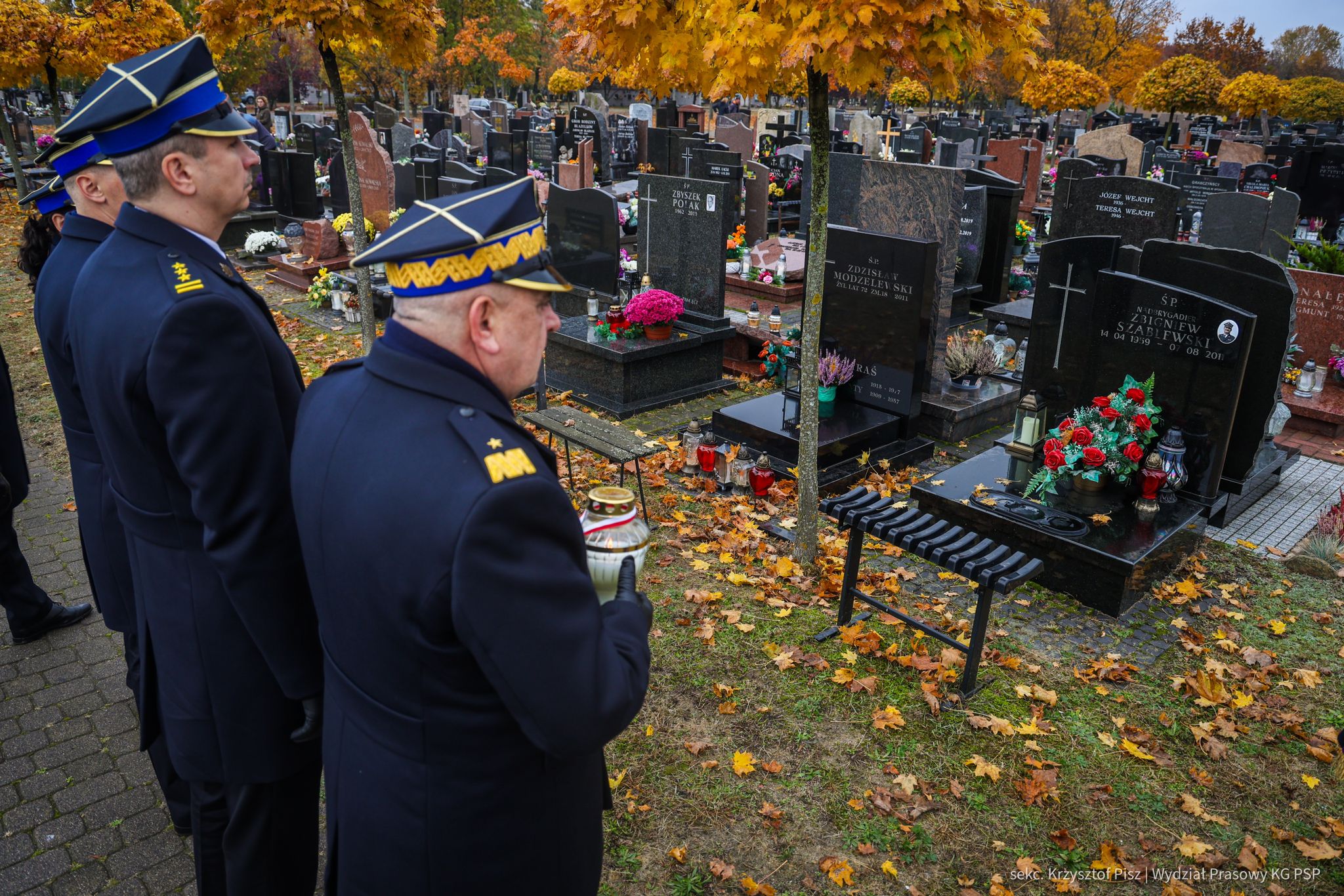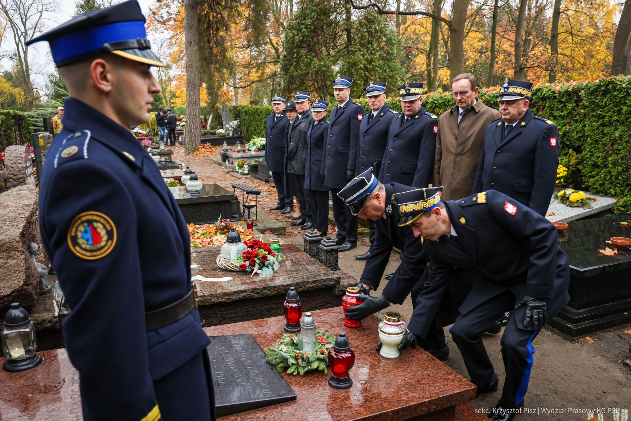 We wtorek, 29 października, delegacja Państwowej Straży Pożarnej pod przewodnictwem nadbryg. dr. inż. Mariusza Feltynowskiego wraz z przedstawicielami Związku Ochotniczych Straży Pożarnych RP na czele z Panem Edwardem Siarka, wiceprezesem Zarządu Głównego ZOSP RP, oddali hołd strażakom spoczywającym na cmentarzu Powązkowskim w Warszawie.