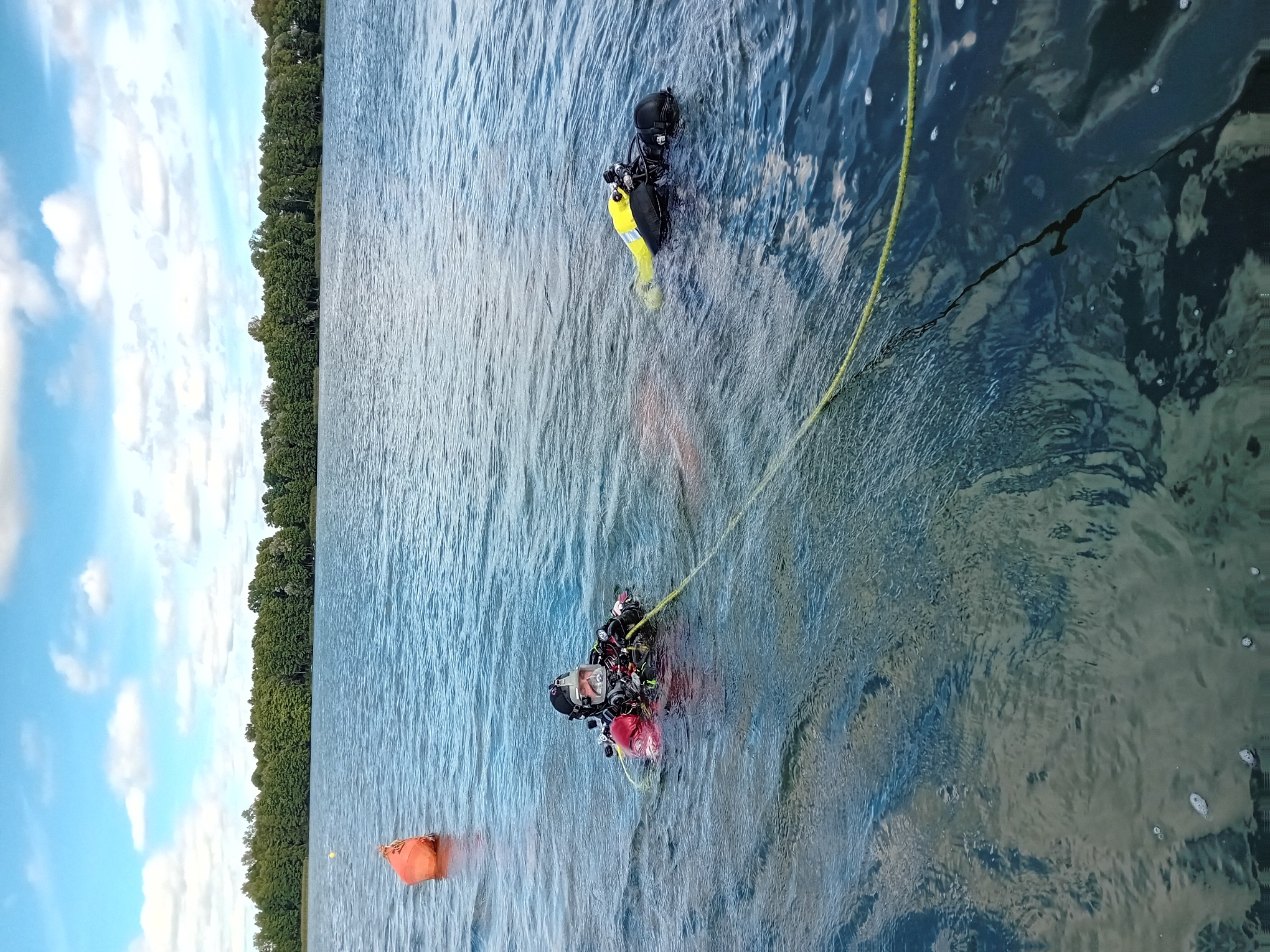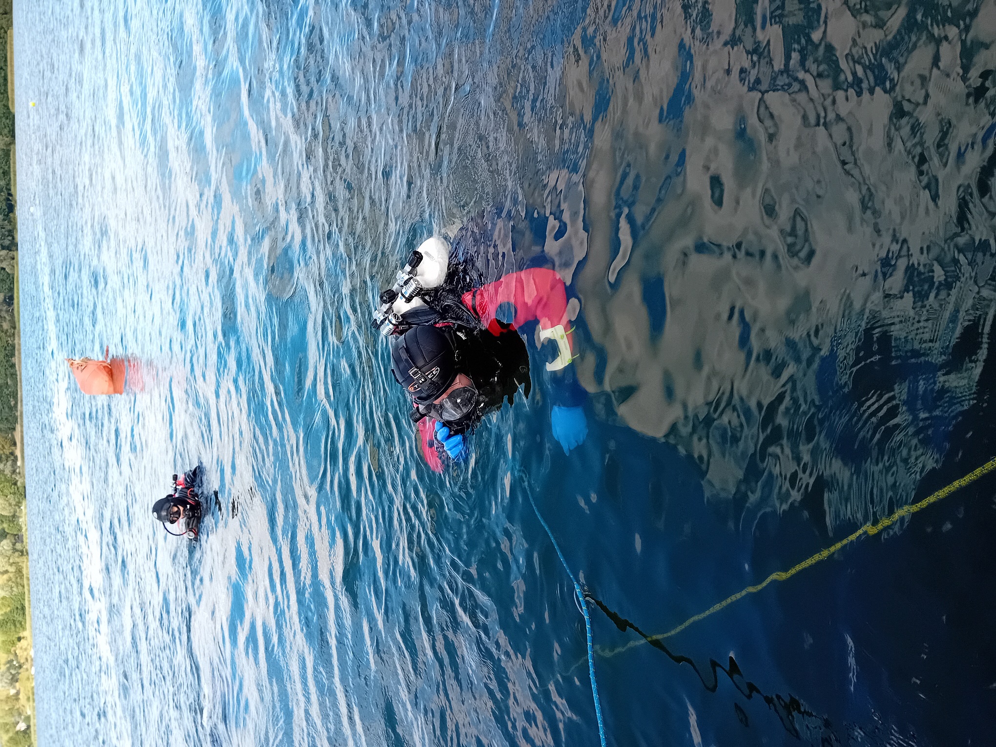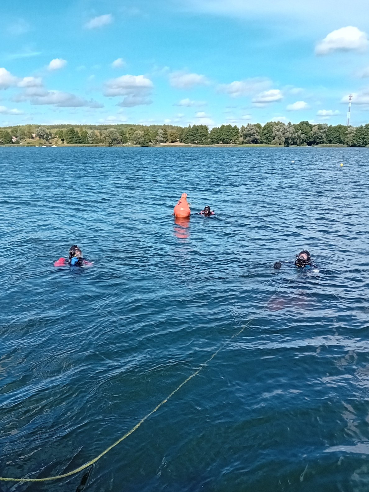 - Przepłynięcie, w sprzęcie nurkowym na wskazanej głębokości wzdłuż liny poręczowej pod wodą, dystansu min. 15 m bez maski z zachowaniem pływalności,