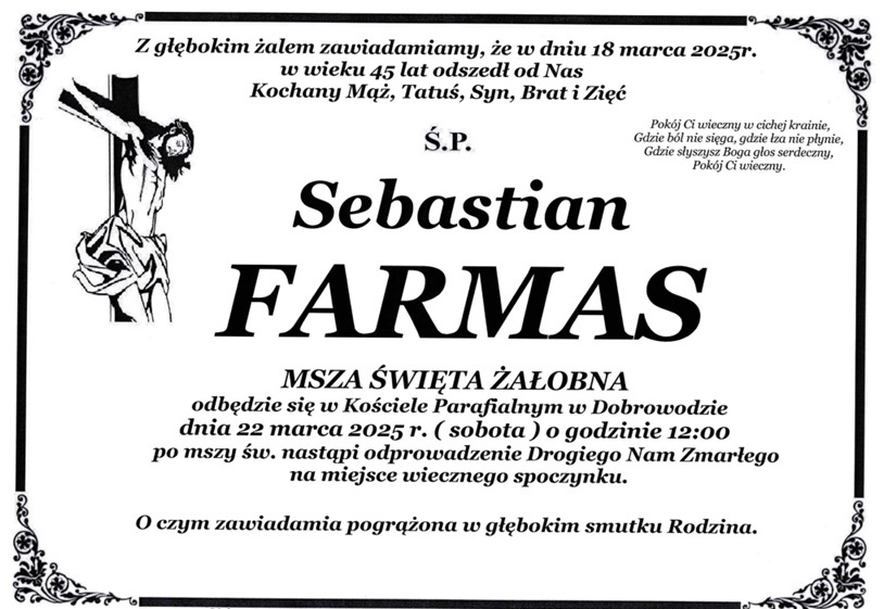 W sobotę 22 marca 2025 roku o godzinie 12:00 w Kościele Parafialnym w Dobrowodzie (pow. buski) odbędą się uroczystości pogrzebowe Świętej Pamięci st. ogn. Sebastiana Farmasa z Komendy Powiatowej Państwowej Straży Pożarnej w Busku - Zdroju.
