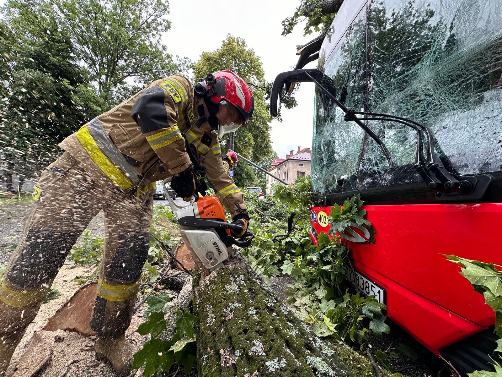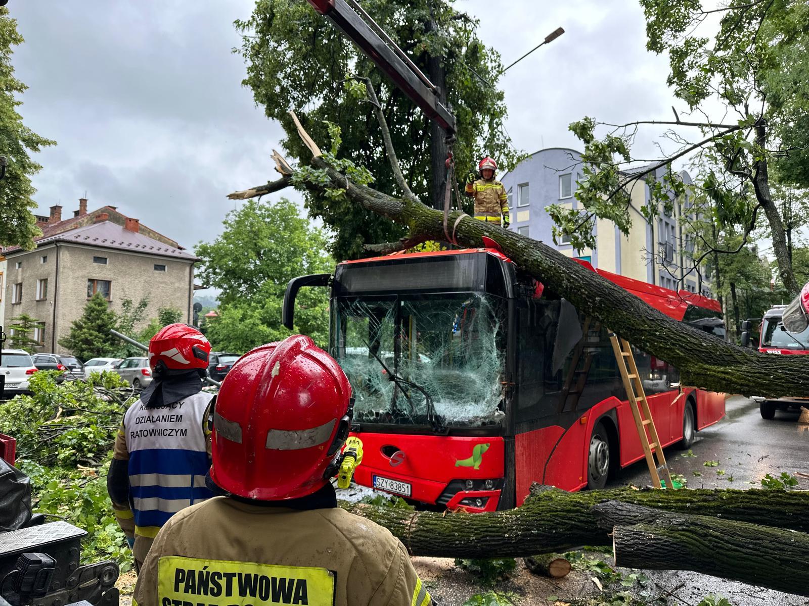W Żywcu na jadący autobus przewróciło się drzewo. W działaniach brało udział kilkunastu strażaków oraz pięć samochodów straży pożarnej.