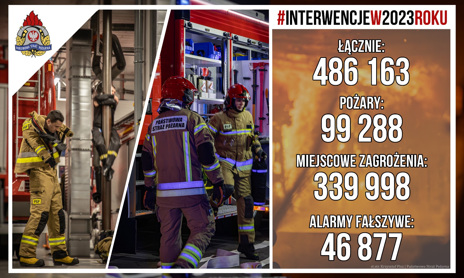 W 2023 roku strażacy odnotowali ponad 486 tysięcy interwencji, w tym dwukrotnie poza granicami kraju: w lutym po trzęsieniu ziemi w Turcji oraz w lipcu w związku z pożarami lasów w Grecji. Jest to o 122 tysiące interwencji mniej niż w rekordowym 2022 roku, kiedy strażacy notowali 608 tysięcy zdarzeń.