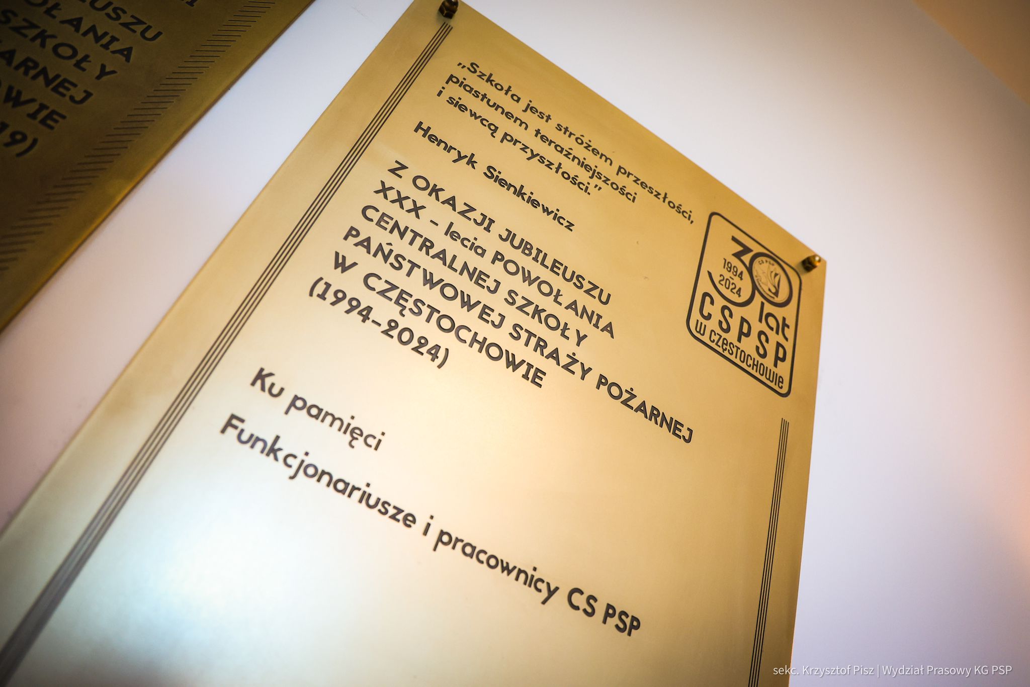 Z okazji obchodów XXX-lecia istnienia Centralnej Szkoły PSP w Częstochowie, komendant główny PSP nadbryg. dr inż. Mariusz Feltynowski uroczyście odsłonił jubileuszową tablicę pamiątkową, na której widnieje cytat Henryka Sienkiewicza: