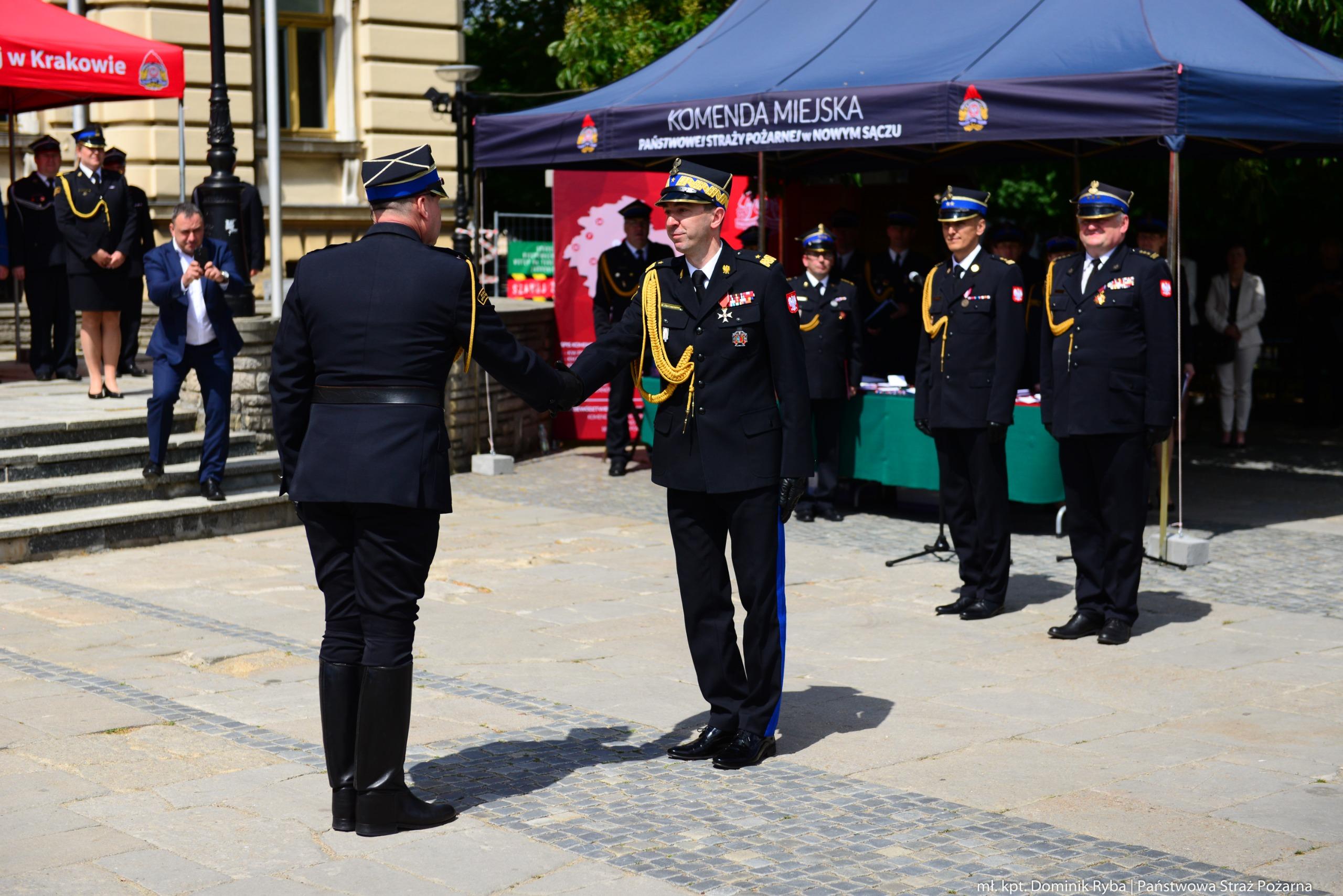 Po zakończonej ceremonii, Komendant Główny PSP zabierając głos w przemówieniu okolicznościowym, nawiązał do historii powstania nowosądeckiej straży pożarnej, której początki sięgają lat 70-tych XIX wieku. Nowy Sącz zaczęły nawiedzać wówczas częste i groźne pożary. Włodarze miasta widząc poważne zagrożenie odpowiedzieli podjęciem uchwały powołującej Straż Ogniową utrzymywaną z pieniędzy miejskich. Tamte wydarzenia dały początek straży pożarnej na tych terenach. Na początku XX wieku Rada Miasta Nowego Sącza na potrzeby straży zakupiła nieruchomość wraz z placem i ten obiekt do dziś należy do strażaków, a mieści się w nim siedziba Jednostki Ratowniczo-Gaśniczej Nr 1.
